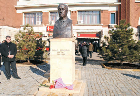 Prezent la eveniment, artistul ne-a precizat ca a fost impresionat de personalitatea lui Toma T. Socolescu si ca, inainte de a realiza opera de arta, a studiat toate realizarile arhitecturale ale acestuia. In cadrul ceremoniei de ieri, bustul a fost dezvelit de catre artist si de catre viceprimarul orasului, Cristian Dumitru. Cei doi, precum si inginerul Ilie Constantin – cercetator al operei marelui arhiect – au vorbit despre personalitatea acestuia si despre zestrea culturala de exceptie lasata de el mostenire prahovenilor. Toma T. Socolescu a realizat proiecte dupa care au fost ridicate mai multe cladiri ce au devenit simboluri ale orasului si ale judetului: fostul Palat al Justitiei, in prezent Palatul Culturii, Catedrala Sfantul „Ioan Botezatorul” – ascunsa, din pacate, partial, de un bloc construit in perioada comunista -, Palatul Scoalelor Comerciale, Casa Corpului Didactic Primar etc. In calitate de profesor, el a instruit 20 de generatii de studenti ai Facultatii de Arhitectura. Printre realizarile sale se mai regaseste infiintarea Muzeului „Hagi Prodan”, a Bibliotecii „Nicolae Iorga”, a Muzeului de Arta din Ploiesti – oras pe care l-a si condus, o scurta perioada de timp.