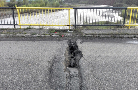 Craterul apărut în corpul podului lasă să se vadă chiar și hăul de dedesubt, pentru că materialul care ar trebui să umple rostul de dilatare – necesar unirii a două bucăți ale structurii – s-a măcinat complet și a căzut în albia râului de dedesubt.
