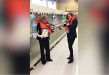 Coloana sonoră din Titanic, cântată de două violoniste în faţa rafturilor goale ale unui...
