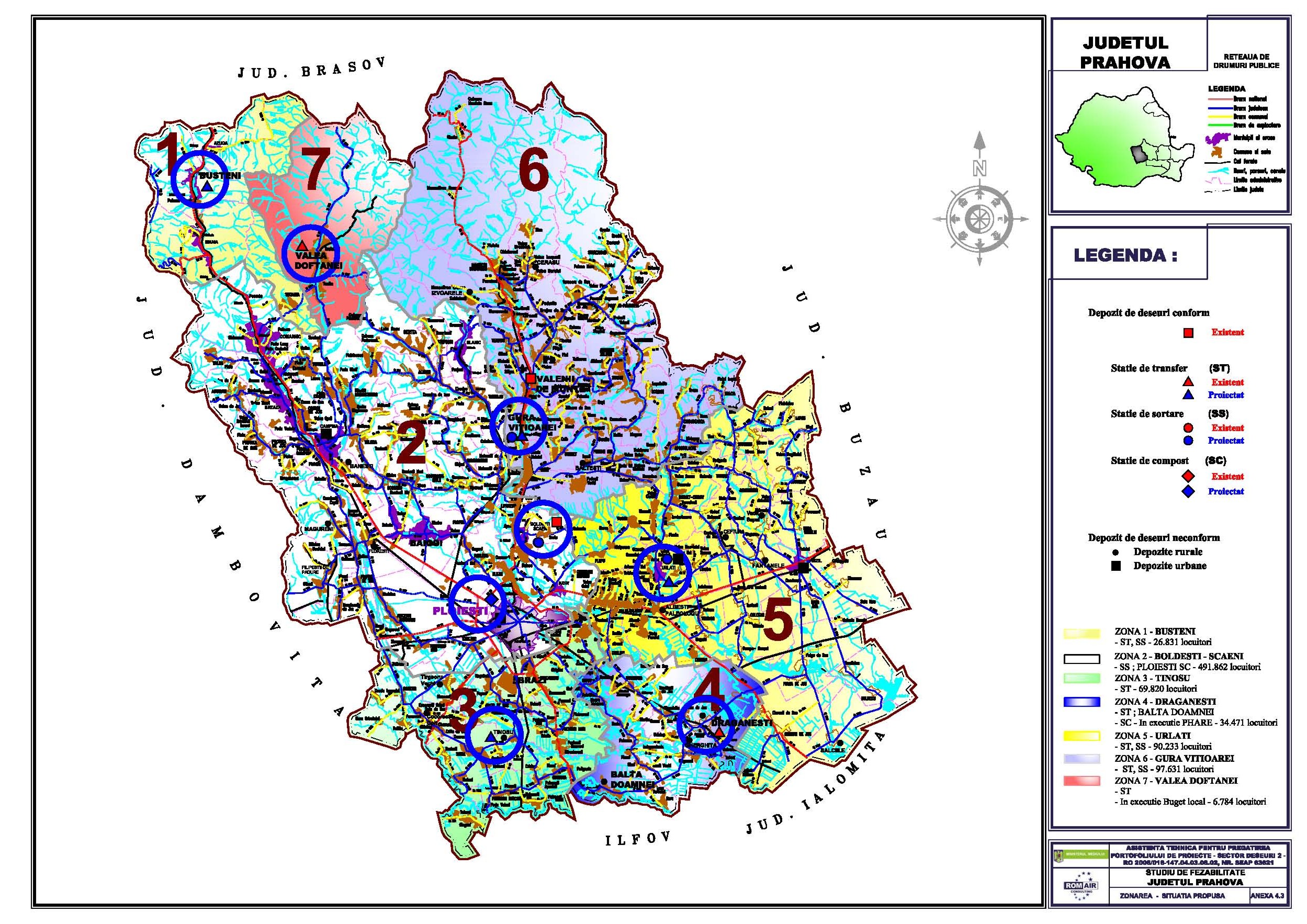 Concret, in cadrul acestuia se vor construi statii de transfer la Busteni, Tinosu, Urlati si Gura Vitioarei, o statie de sortare la Boldesti-Scaeni si se va deschide o statie de tratare mecano-biologica situata pe amplasamentul de la Ploiesti. De asemenea, vor mai fi necesare echipamente si asistenta tehnica de specialitate, dar si de o campanie de informare si de constientizare a populatiei. Un alt element important in vederea eficientizarii activitatilor de management al deseurilor este impartirea judetului in 7 zone de transport. Prima zona este reprezentata de orasele statiuni de pe Valea Prahovei – Sinaia, Busteni, Azuga. Zona a doua va avea in centru statia de sortare de la Boldesti, incluzand localitatile urbane importante – Ploiesti, Campina, dar si orasele Baicoi, Boldesti-Scaeni, Comarnic, Breaza, Plopeni, Slanic, plus 29 de comune aferente. Totalul populatiei din zona 2 este de 491.862 locuitori (344.424 in mediul urban si 147.438 in mediul rural).