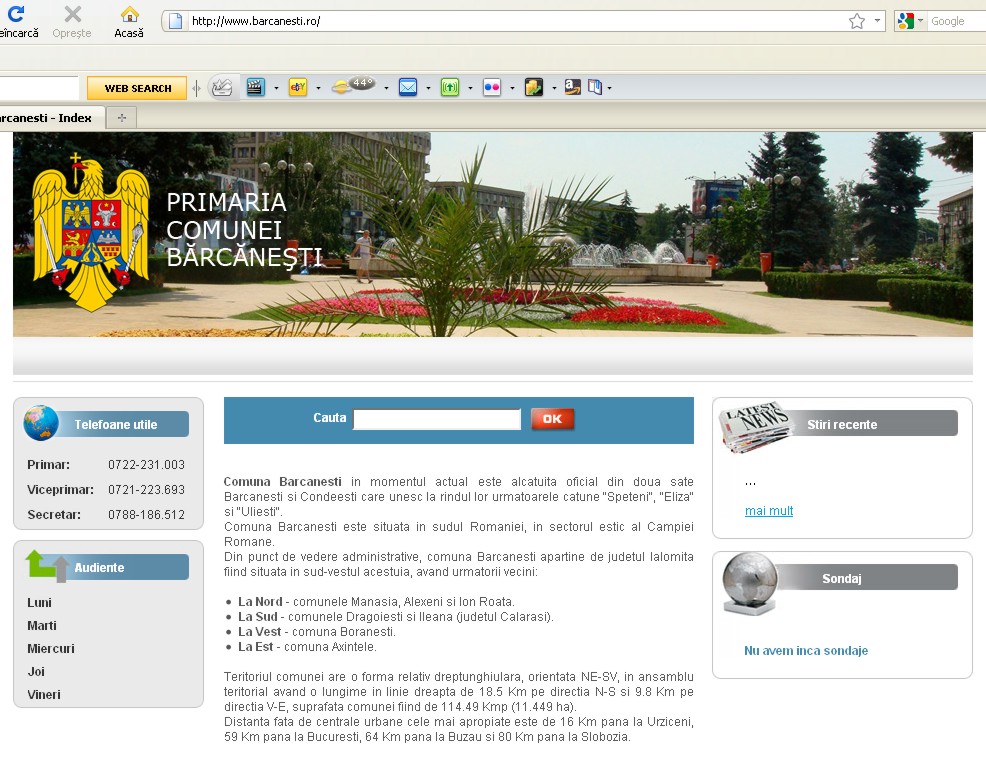 Astfel, daca vreun prahovean sau orice roman doreste sa se informeze in legatura cu noutatile din comuna Barcanesti, poate afla ca primarul este Valerica Herea, si nu Gheorghe Dima, precum si orarul audientelor sustinute, saptamanal, de conducerea Primariei. Insa nu cea a Primariei din Barcanesti – Prahova, ci a Primariei Barcanesti – Ialomita!