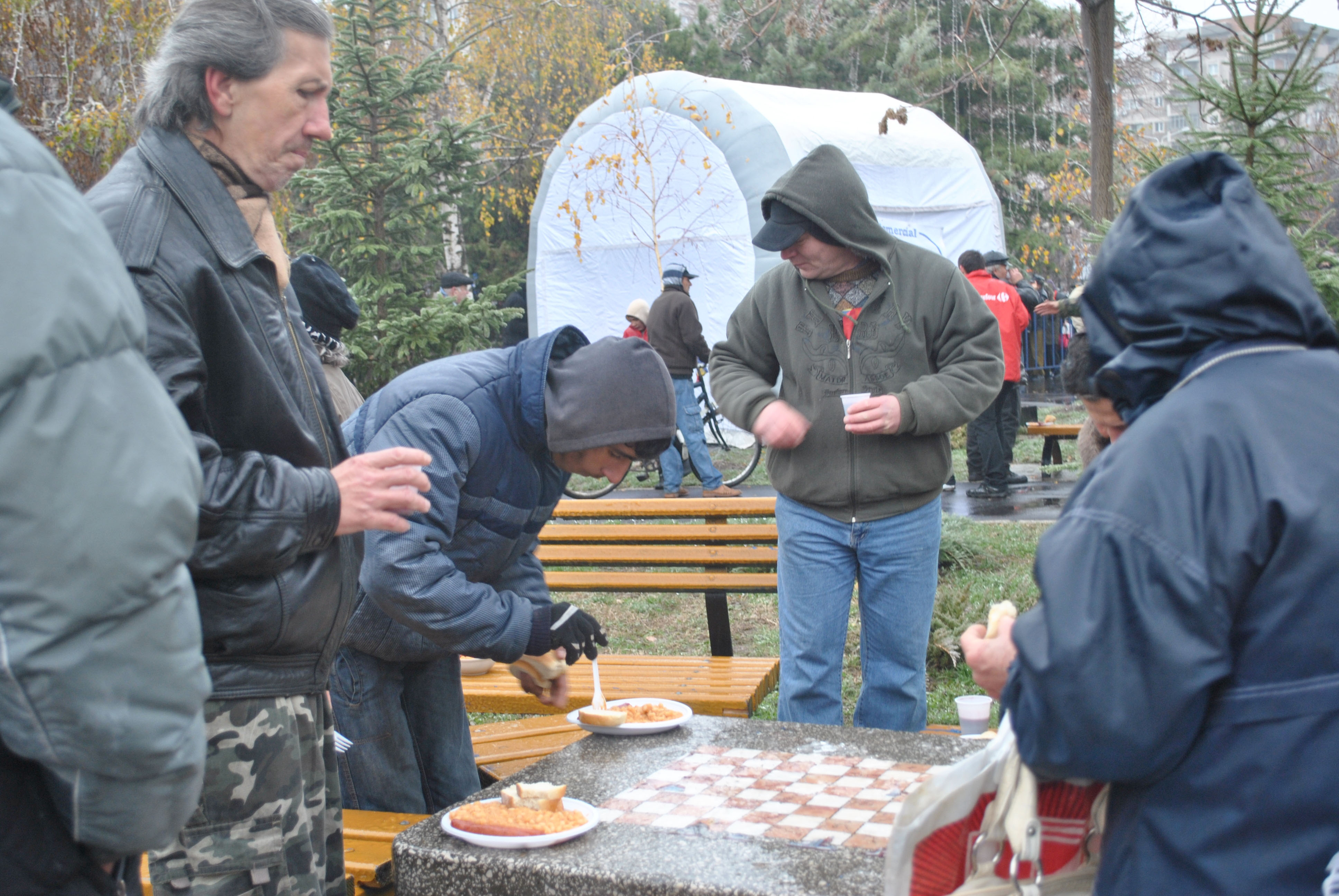Mesele de sah din Parcul Mihai Viteazul au fost transformate ad-hoc in locuri de servire a fasolei cu carnati, de catre multi dintre cei care au asteptat, rabdatori, sa le vina randul. Oameni sarmani – si nu numai – au mai stat o data dupa gardurile jandarmilor, pentru inca o portie de mancare gratuita, dat fiind ca numarul celor care au poftit la fasole a fost mult mai mic decat cel de anul trecut.