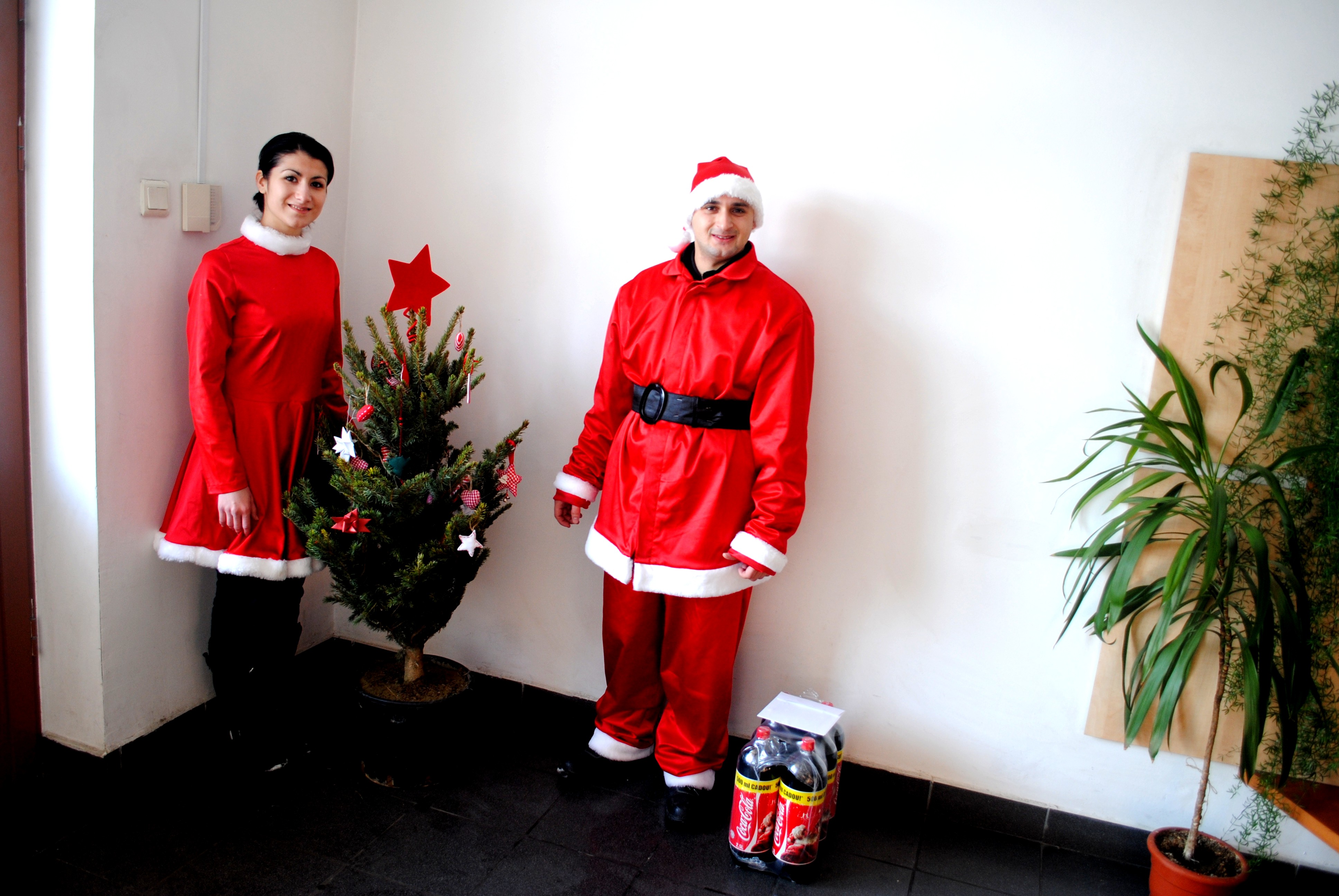 Pastrand traditia, reprezentantii firmei Coca Cola au dorit ca si anul acesta sa ne reaminteasca faptul ca se apropie vremea impodobirii bradului de Craciun. Asa se face ca ieri, in jurul pranzului, trei reprezentanti ai firmei amintite – doi dintre ei intruchipandu-l pe Mos Craciun – ne-au vizitat la sediul redactiei, din strada Democratiei nr. 28 A, si ne-au adus in dar un brad „eco”, impodobit cu beteala si globulete in culorile traditionale ale companiei.