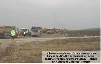 Asa cum era de asteptat, cele mai mari sume le au de incasat societatile care au in lucru cele mai mari proiecte in infrastructura drumurilor nationale si de autostrazi. Printre acestea, se regasesc trei dintre constructorii sectorului Moara Vlasiei – Ploiesti din autostrada Bucuresti – Ploiesti, consortiul format din UMB Spedition, Pa&Co International, Euroconstruct Trading 98 si Com-Axa. Pe primul loc se situeaza firma detinuta de Dorinel Umbrarescu – supranumit in urma cu cativa ani „Regele asfaltului” – “UMB Spedition Bacau”, care avea de incasat, la sfarsitul anului trecut, o suma impresionanta – 451.028.051,94 de lei! Pe locul sase in lista firmelor care au de incasat milioane de lei noi de la CNADNR se afla o alta societate care lucreaza la autostrada, Euroconstruct Trading 98, careia ar trebui sa ii intre in conturi suma de 53.471.157,75 de lei. Pa&Co International are, de asemenea, de incasat 15,5 milioane de lei de la aceeasi companie nationala.
