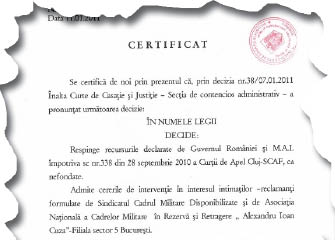 Decizia din 7 ianuarie a Inaltei Curti de Casatie si Justitie privind suspendarea aplicarii Hotararii de Guvern 735/2010 in ceea ce priveste recalcularea pensiilor militare, ale politistilor si ale functionarilor din sistemul penitenciar este valabila doar pentru cei 251 pensionari-militari care au actionat in instanta decizia Guvernului. Pentru restul pensionarilor care au activat in MApN si MAI, sosirea deciziilor de pensionare pe luna aceasta a picat ca un trasnet. Toti se asteptau la anumite reduceri, dar sumele le-au fost injumatatite si, in cazul altora, mai mult decat atat. “Am primit mai putin cu 52% fata de luna decembrie. Am 65 de ani, am o familie, am rate la banci. Cine putea sa creada ca, dupa ce am desfasurat 40 de ani de activitate, se vor gandi guvernantii ca am pensia prea mare si ca trebuie redusa in halul asta? Adeverintele cu veniturile din perioada activa, emise de catre minister in vederea recalcularii pensiei, contin foarte multe lipsuri si date eronate. Acum, sunt terminat. Nu o sa mai pot plati nici jumatate din cheltuielile lunare”, ne-a spus Andrei Popa, un pensionar militar din Ploiesti cu gradul de locotenent-colonel. “Eu intruneam toate conditiile precizate in noua lege si nu avea cum sa mai taie. Am trimis dosarul complet catre Ministerul Apararii. Mi-au taiat 49% din pensie. Am calculat acasa, pe baza acestui nou sistem de calcul, pe toate partile. Nu imi iese in niciun fel suma primita. Zici ca au taiat cu ochii inchisi”, ne-a declarat un maior-pensionar, tot din Ploiesti. Aceeasi problema ii framanta si pe membrii ploiesteni ai Sindicatului Cadrelor Militare Disponibilizate, in Rezerva si in Retragere (SCMD) cel care a inaintat si actiune in instanta. “Avem 224 de membri in Ploiesti, un numar nu foarte mare dar care a inregistrat o crestere importanta in ultima vreme, ca urmare a conditiilor incerte in care ne aflam. In Prahova exista, deocamdata, aproape 8000 de pensionari militari care sunt, cu totii, afectati de aceste masuri. Majoritatea membrilor sunt constituiti parte reclamanta alaturi de presedintele Sindicatului, colonel (r) doctor Mircea Dogaru, la acest proces. Decizia Curtii a fost data, iar suspendarea recalcularii, noi consideram ca ar fi trebuit sa se aplice tuturor pensionarilor militari. In legatura cu acele adeverinte de venit emise de minister, sunt niste falsuri grosolane in proportie de 90%, care nu au nicio valoare legala, deoarece sunt gresite si contin date inventate. Nu putem lupta decat daca suntem uniti, iar sindicatul nostru, avand personalitate juridica, poate reprezenta cel mai bine interesele militarilor in rezerva sau in retragere”, ne-a declarat colonelul (r) Ion Visan, presedintele filialei SCMD Ploiesti. In conferinta de presa sustinuta marti 11 ianuarie, oficiali ai Ministerului Apararii Nationale si-au recunoscut greseala de a fi calculat aceste pensii fara a avea la baza adeverintele de venit ale fostelor cadre, si au promis ca vor achita retroactiv sumele pierdute, insa s-au si aparat sustinand ca acuzatiile rezervistilor sunt nefondate. Intr-un comunicat remis pe site-ul sindicatului militarilor in rezerva, semnat de catre presedintele acestuia, colonel (r) Mircea Dogaru se arata ca “domnii Oprea, Igas, Boc n-au tinut seama de niciun plafon de 3000 de lei, motiv pentru care ne permitem sa-l atentionam pe domnul presedinte al Romaniei ca a fost mintit. “Batalia decisiva se va da la recursul pe hotararea de anulare a HG 735/2010, pronuntata de Curtea de Apel Cluj, recurs care nu a fost, inca, cerut de Guvern, drept pentru care nu stim cand se va judeca – poate in mai, poate in iunie”, afirma in alt comunicat liderul organizatiei. Acesta mai promite ca sindicatul va face plangeri penale impotriva ministrilor Apararii, Internelor, si tuturor emitentilor de adeverinte de venit, pentru infractiunea de fals, uz de fals si abuz. Acum, sindicalistii militari se pregatesc sa depuna contestatii pe baza cupoanelor de pensie primite, catre ministerele in cadrul carora au activat.