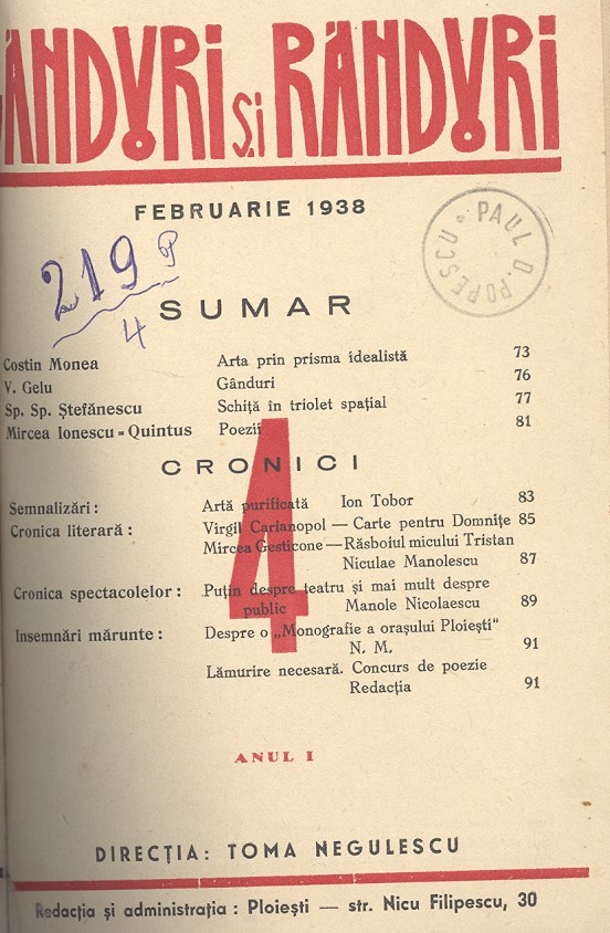 Este greu de spus ce a provocat incetarea aparitiei „Ganduri si Randuri”. In ultimul numar nu se anunta nimic in acest sens, nici nu lasa sa se vada intentia gruparii de a renunta sau anumite greutati cu care s-ar confrunta. O prima posibilitate ar fi aceea a complicarii formelor birocratice pentru obtinerea aprobarii de aparitie. In 1937, era suficienta o cerere la prefectura judetului si apoi, dupa avizarea de catre prefect, publicatia putea fi inscrisa. Dupa februarie 1938, cand regele Carol II a instaurat regimul sau autoritar, treptat, lucrurile au inceput sa se schimbe. Se cereau formalitati suplimentare pentru aparitia unui periodic (neoficial se cerea si o nota de la “Siguranta“) si pe langa prefectura, se instituia un birou de presa, care efectua o cenzura, mai mult sau mai putin discreta. O dovada in acest sens pare sa fie un text tiparit, numai la ultimul numar, imediat sub titlu: „Inscrisa prin Ordonanta Presidentiala cu No.9268-1938”. Putem banui deci ca formalitatile acestea noi, care implicau si Tribunalul, sa-i fi descurajat pe initiatori. Se poate insa foarte bine ca motivul incetarii sa-l fi constituit greutatile materiale. Initiatorii proveneau, mai toti, din familii instarite; totusi nu credem ca la varsta lor, dispuneau de sume importante de bani. Chiar ei marturiseau ca <>. In ceea ce priveste incasarile lor, erau minime. Se prevazuse ca pret de vanzare 5 lei numarul (numai ultimul, cel triplu era 10 lei) si chiar abonamentele anuale erau 50 sau 100 de lei, dar este de presupus ca tirajul nu era prea mare, ca multe exemplare se ofereau gratuit, ca nu se prea cumparau, astfel incat fiecare aparitie afecta serios economiile initiatorilor. Mai putin probabil este ca activitatea sa se fi intrerupt din cauza unor neintelegeri intre membrii gruparii. In schimb, este posibil ca acestia, mai toti studenti la Drept, ajunsi in ani mai mari, trebuind sa se pregateasca mai intens, sa-si treaca si examenele restante, in vederea terminarii facultatii, sa fi fost obligati sa petreaca mai mult timp in Bucuresti. Dupa cum se poate, foarte bine, ca motivul sa fi rezultat din toate acestea sau sa fi fost un altul. Revista a aparut sub forma unui caiet (23,5×16 cm), pe hartie buna, usor galbuie si cu coperta din hartie de aceeasi nuanta, dar mai groasa. Numarul de pagini diferea de la aparitie la aparitie: 20 (la numerele 1,4 si 7), 24 (la nr. 2), 28 (la numerele 3 si 6), 32 (la nr. 5) si 48 (la nr.8-10). Publicatia a fost imprimata, de la inceput pana la sfarsit, la “Tipografia Romaneasca“ S.A. Ploiesti, iar redactia si administratia se gaseau pe strada Nicolae Filipescu nr. 26, la domiciliul unuia dintre initiatori. Fiecare numar era impartit, foarte distinct, in doua parti. Prima, care nu era titrata, cuprindea studii, eseuri si creatii literare, cea de-a doua, intitulata “cronici“, avea rubrici ca: „semnalizari” (economice, sociale, politice), “cronica literara“, “plastica“, a “spectacolelor“ si “insemnari marunte“. Dar, tocmai in niste asemenea “insemnari“, se definea, in lipsa unui articol program sau a unui editorial – scopul revistei, liniile pe care aceasta intelegea sa mearga: <>