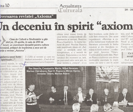 Alaturi de recenzii au fost publicate sinteze, studii si articole despre scriitori mai vechi sau contemporani. De obicei, acestea sunt grupate in jurul unei sarbatori sau comemorari. La Arghezi, semneaza I. Balu (2 articole), I. Tataru, Luminita Burlacu, Ciprian Ded, Grig. Miresan, Constantin Trandafir, Marin Besteliu. La Bacovia semneaza: I. Balu, Const. Trandafir (2), Ieronim Tataru (2), Const. Calin (2), Viorica Raduta, Bogdan Titei. Si mai multe condeie axiomiste s-au grabit sa-l comemoreze si sa-l admire pe Blaga….