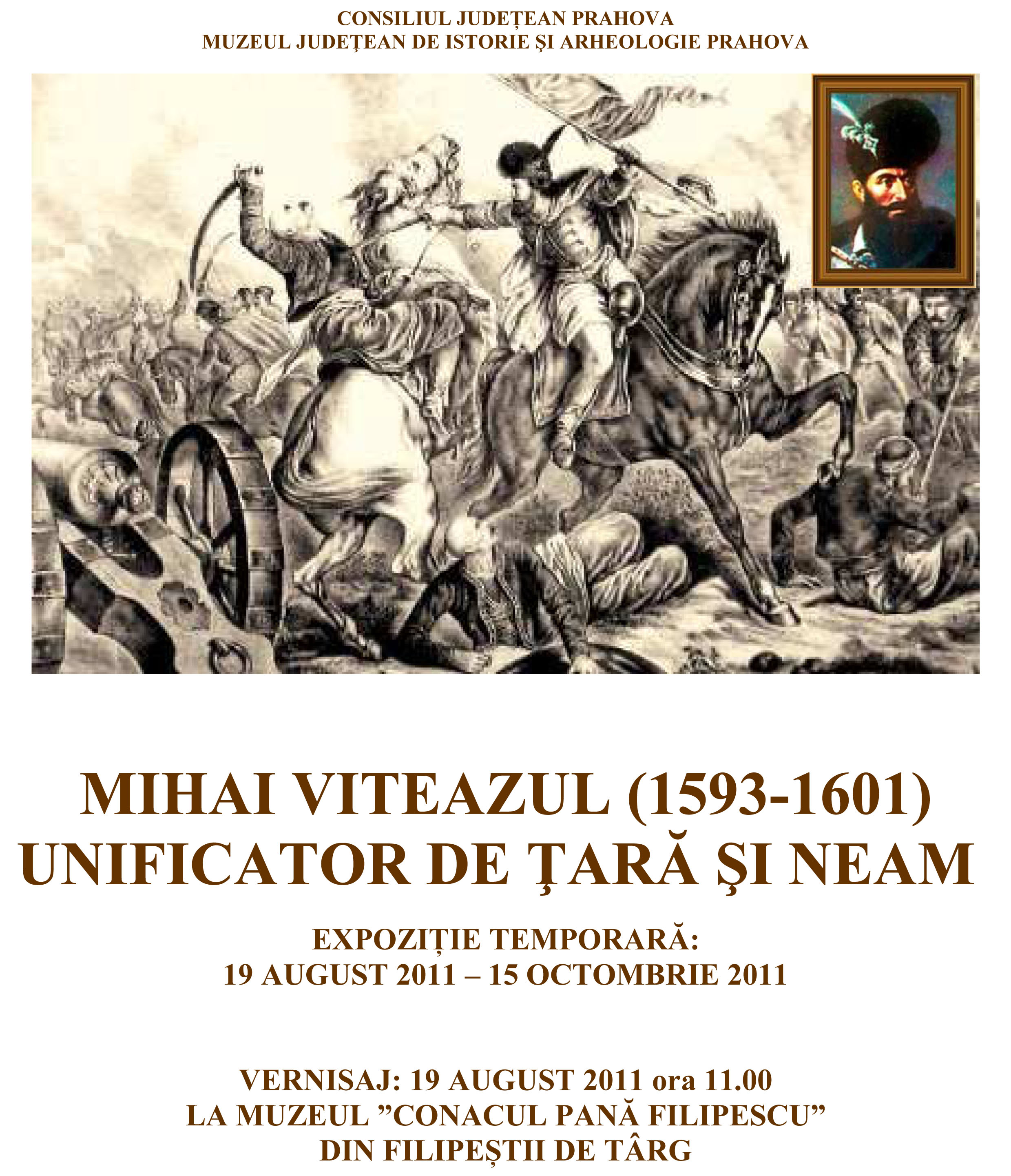 Muzeul Judeţean de Istorie şi Arheologie Prahova vernisează la Conacul „Pană Filipescu” din Filipeştii de Târg, în data de 19 august 2011, ora 11.00, expoziţia temporară „Mihai Viteazul (1593-1601) – unificator de ţară şi neam”. Conacul „Pană Filipescu” din Filipeştii de Târg este un monument de arhitectură din secolul al XVIII-lea şi prin expoziţia amintită se încearcă rememorarea chipului şi a faptelor de arme ale întâiului unificator al Ţărilor Române – Mihai Viteazul – de la a cărui moarte se împlinesc, anul acesta, 410 ani. În expoziţie sunt prezente lucrări din patrimoniul Muzeului Judeţean de Istorie şi Arheologie Prahova, reprezentări plastice- pictură de şevalet, gravuri, litografii şi cromolitografii de secol XIX- precum şi arme albe şi de foc. Expoziţia va rămâne deschisă până la 15 octombrie 2011.