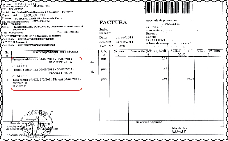 Mai mult decat atat, calculul facturii aferente lunii septembrie pentru asociatiile de proprietari s-a efectuat conform contractelor incheiate in data de 1 aprilie 2010, in timp ce taxa de rampa este introdusa in factura in conformitate cu hotararea Consiliului Local Ploiesti care stabilea, la sfarsitul lunii august 2011, atat nivelul noilor tarife ale Rosal Grup, cat si nivelul taxei de rampa.