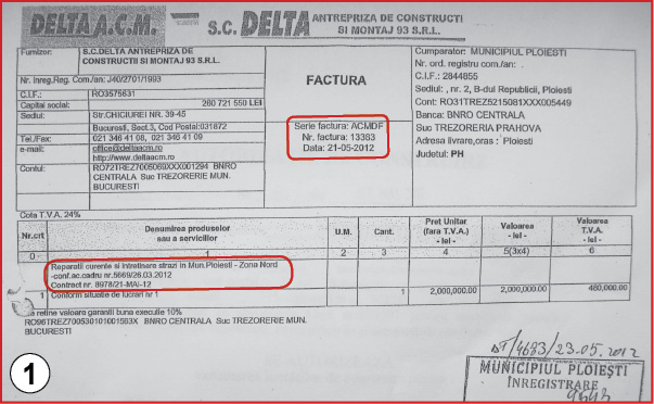 In luna martie, respectiv la inceputul lunii aprilie, Primaria Ploiesti a incheiat cu o societate de constructii din Bucuresti – Delta ACM 93 – doua acorduri-cadru pentru reparatii curente si intretinere strazi in zonele nord si central-sud-est. Valoarea primului acord-cadru, incheiat pentru repararea unor strazi din nordul municipiului Ploiesti, s-a ridicat la circa sase milioane de lei noi, fara TVA. In baza acestui acord-cadru s-au incheiat doua contracte subsecvente. Unde este buba, in acest caz? Delta ACM 93 SRL Bucuresti a emis o factura, in valoare de 2,48 milioane de lei, in ziua de 21 mai 2012, exact in ziua in care a fost semnat contractul subsecvent nr. 8978, potrivit informatiilor din factura emisa de catre constructor (foto 1) ! Este drept, aceasta factura a fost inregistrata de catre municipalitatea ploiesteana in ziua de 23 mai, insa acest fapt nu schimba datele problemei…