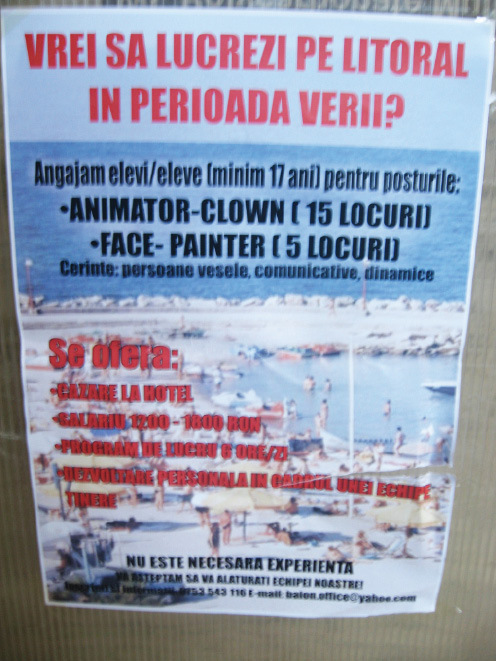 Odata cu vacanta de vara au aparut si primele oferte de locuri de munca sezoniere pentru elevi, liceeni sau studenti care doresc sa-si castige singuri banii de buzunar. Fie ca sunt postate pe site-urile de profil, fie la anunturile tiparite din ziare sau chiar pe usile institutiilor de invatamant, ofertele sunt dintre cele mai diverse : vanzator de baloane modelate pe plaja din Constanta, animator sau face painter tot pe litoralul romanesc, chelner, barman, ospatar, camerista in diverse hoteluri din Grecia, Germania, Cipru, Spania etc., dar si locuri de munca pe perioada determinata in cadrul unor institutii, cum ar fi de pilda Agentia pentru Dezvoltare Regionala Sud Muntenia, care tocmai a incheiat un astfel de concurs destinat studentilor si care se afla deja la al patrulea an de desfasurare. Un anunt de angajare a fost postat recent si pe holurile Universitatii Petrol-Gaze din Ploiesti (foto). Potrivit acestuia, se cauta tineri pentru posturile de animator clown (15 locuri) si face painter (5 locuri), oferindu-se cazare la hotel, un salariu de aproximativ 1000 de lei pentru sase ore de munca pe zi, nefiind necesara experienta in acest sens.