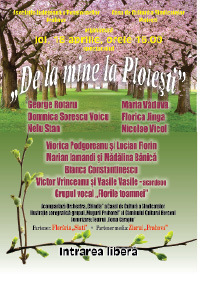 În miez de aprilie, o iniţiativă frumoasă ca o zi de primăvară face ca un grup de artişti să-şi alăture vocile, sufletele şi preţuirea pentru public într-un spectacol ce se vrea dăruit mai ales acelora care găsesc în cântecul popular românesc bucurie şi alinare, speranţă şi lumină, credinţă şi dorinţa întoarcerii, măcar din când în când, la „rădăcini”. Ideii însufleţite până la detaliu de artista Domnica Sorescu Voicu – care a încântat multe generaţii interpretând romanţe, dar şi folclor – şi susţinută de Asociaţia Judeţeană a Pensionarilor Prahova şi Casa de Cultură a Sindicatelor Ploieşti, îi vor da viaţă joi – 18 aprilie a.c., cu începere de la ora 16,00, cunoscuţi artişti. Fără a pretinde vreun onorariu, vor cânta pentru public (intrarea acestuia fiind liberă), alături de iniţiatoarea spectacolului „De la mine la Ploieşti“, interpreţi care au bucurat de multe ori- adesea chiar pe aceeaşi scenă a Casei de Cultură a Sindicatelor pe care vor evolua şi acum, pe cei care i-au ascultat şi ,cu siguranţă, la fel va fi şi de această dată: George Rotaru, Maria Văduva, Nelu Stan, Florica Jinga, Nicolae Vicol,Viorica Podgoreanu şi Lucian Florin,Marian Iamandi şi Mădălina Bănică, Bianca Constantinescu,Victor Vrînceanu şi Vasile Vasile-acordeon, Grupul vocal „Florile toamnei”. Va acompania Orchestra „Chindia” a Casei de Cultură a Sindicatelor, ilustraţia coregrafică fiind semnată de Grupul „Mugurii Prahovei” al Căminului Cultural Berceni, iar sonorizarea fiind asigurată de echipa tehnică a Teatrului „Toma Caragiu”. Într-un spectacol dăruit din suflet – ziarul Prahova susţinându-l ca partener media – se mai adaugă o dovadă de generozitate: „florile cu suflet” de la Florăria „SIATI” vor aduce un colţ de primăvară pe scenă şi în sala de spectacol.