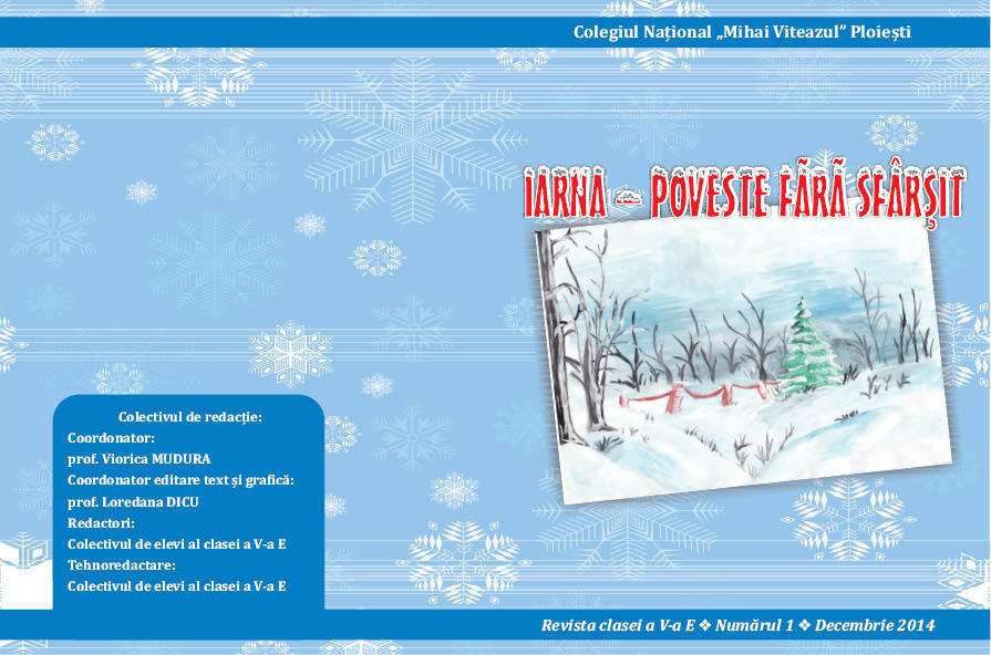 „Iubite cititorule, /Am adunat în cuvinte povestea iernii şi bucuria sufletului nostru, /Ţi le dăruim cu drag, pentru că tu veghezi împlinirile noastre de fiecare zi”. Astfel se deschide cel dintâi număr al revistei clasei a V-a E de la Colegiul Naţional „ Mihai Viteazul” din Ploieşti, iar fiecare cuvânt, fiecare desen dezvăluie apoi candoarea, frumuseţea şi magia unei vârste unice. O vârstă care adună laolaltă zânele din poveştile citite de părinţi şi de bunici, dorinţele mărturisite în scrisorile către Moş Crăciun, aromele dulcege ale serii de Ajun, bucuria primei zăpezi şi căldura sărbătorilor petrecute în familie.O vârstă pe care noi, cei mari, am fi privilegiaţi dacă, învăţând de la ei, am putea-o păstra, cât mai mult, ascunsă în sufletele şi în minţile noastre, împovărate de trecerea timpului. Filă cu filă, revista pe care au alcătuit-o talentaţii elevi, îndrumaţi, cu dăruire, de profesoara Viorica Mudura şi diriginta clasei- prof. Loredana Dicu (care merită toată preţuirea pentru iniţiativa de a strânge laolaltă gândurile copiilor) – va rămâne, cu siguranţă, peste timp, un nepreţuit hrisov de sărbătoare. Căruia îi descifrează pe deplin acum înţelesurile mai ales părinţii şi profesorii , dar pe care cu siguranţă îl vor redescoperi, cu înţelepciunea vârstelor ce vor urma, şi autorii de acum ai poveştii fără de sfârşit: Luca Sebastian Haydl,Sebastian Dănescu, David Cristescu, Alexandru Iulian Saulea, Mara Schimbeschi,Teodor Cristian Matei, Maria Alexandra Mihalcea, Daria Maria Savu, Melissa Nicoleta Tudor,Andrei Cristian Neacşu,Andra Vanessa Doroftei,David Gabriel Chira, Maria Ştefania, Gheorghe,Anaid Gabriela Panait,Robert Şelaru, Bogdan Nicolae Năstase, Răzvan Lefter,Teodora Maria Răcăşan, Maria Teodora Nicolescu, Ştefania Emilia Tunaru, Darius Nicholas Alexandrescu, Rareş Iustin Muşat, Cristiana Toacă, Ana Toma (text şi desene), Tudor Botnaru, Mihnea Roşu, Ruxandra Iosif, Daria Mitrescu (desene).