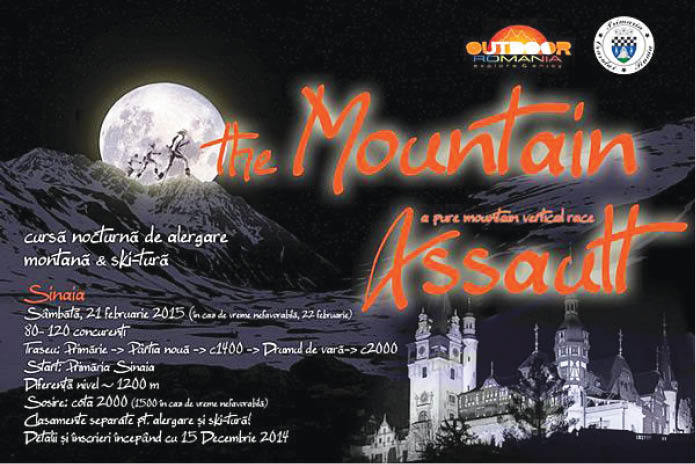 Asociaţia Outdoor România în parteneriat cu Primăria Oraşului Sinaia, organizează, pe 21 februarie, prima ediţie a concursului “The Mountain Assault” (Cucerirea muntelui). Este vorba despre o cursă nocturnă, individuală, desfăşurată, în paralel, la două discipline: schi de tură şi alergare montană. Competiţia este deschisă acelora care au o stare bună de sănătate, cel puţin un nivel mediu de pregătire fizică pentru a parcurge un traseu alpin pe timp de iarnă şi un echipament adecvat. Lungimea traseului “The Mountain Assault 2015” este de 6,69 km cu o diferenţă de nivel de +1217m. Concurenţii vor parcurge următorul traseu: Primăria Sinaia ( la ora 17.00 se va da startul) – Staţia Inferioară a Telegondolei Sinaia – Pârtia Nouă – Cota 1400 – Pârtia Drumul de Vară – Cabana Mioriţa (Cota 2000). Traseul pentru schi alpin şi alergare sunt comune, cu menţiunea că traseului de schi alpin i se păstrează un culoar de aproximativ 2-3 m lăţime. Concurenţilor nu le este permis să utilizeze scurtăturile. Există trei categorii de concurs la cele două probe: bărbaţi cu vârste sub 35 ani, bărbaţi cu vârste de peste 35 ani, fete. Vor fi acordate premii primilor trei clasaţi la fiecare categorie, cât şi alte distincţii. Competiţia a stârnit interesul multor iubitori ai muntelui, cele 100 de locuri puse la dispoziţie concurenţilor de către organizatori fiind ocupate deja.