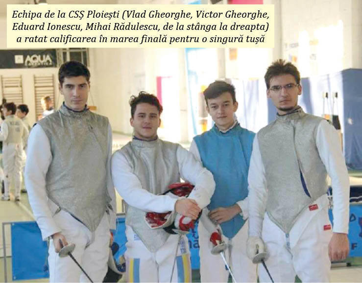 La Bucureşti, în zilele de 13 şi 14 ianuarie, s-au desfăşurat probele masculine din cadrul Campionatelor Naţionale de floretă pentru juniori (13-20 ani). La startul competiţiei s-au aliniat şi reprezentanţii Clubului Sportiv Şcolar Ploieşti, pregătiţi de profesoara Rodica Popescu.