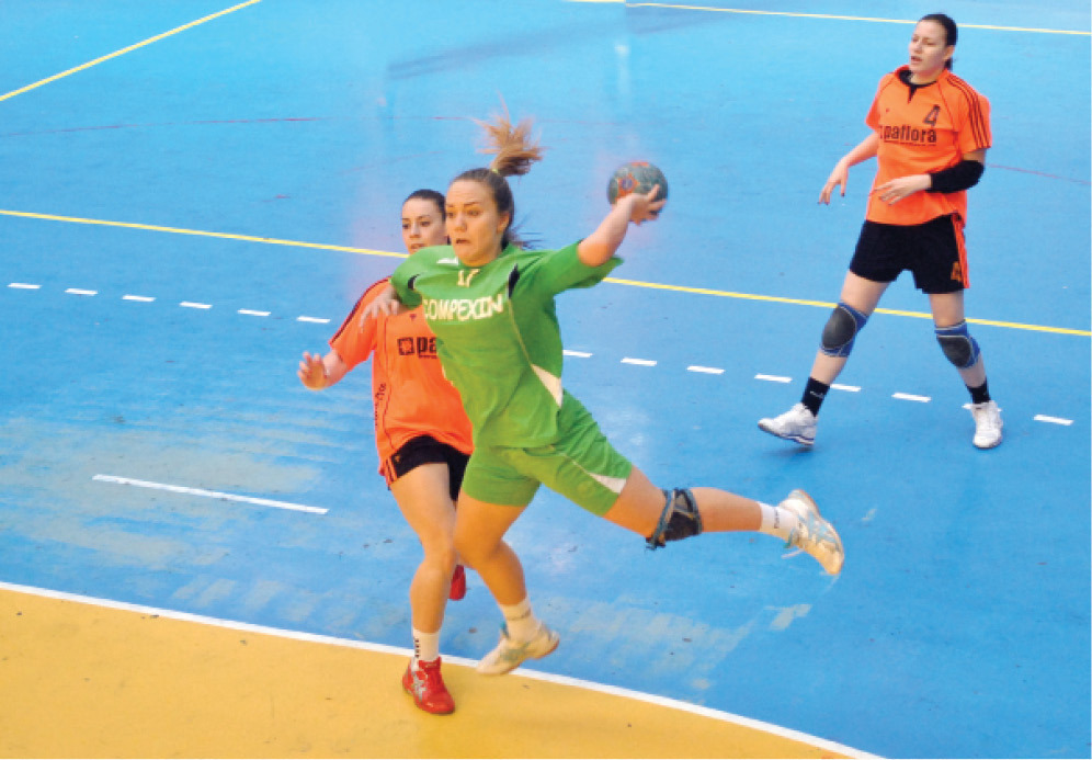 Extreme stânga: Alexandra Dindiligan (”U” Alexandrion Cluj), Hermina Stoicănescu (HCM Râmnicu Vâlcea)