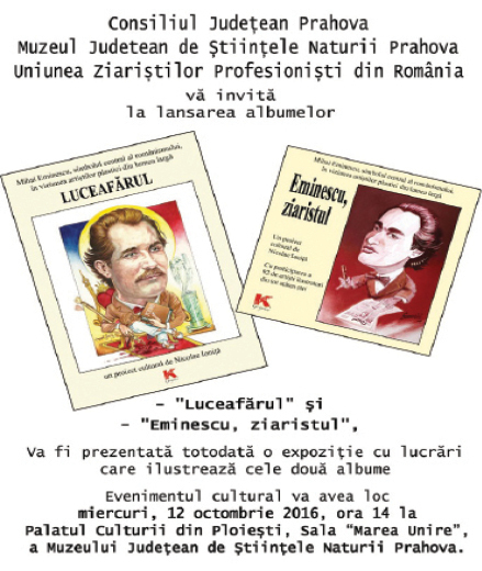 În Sala „Marea Unirea” a Palatului Culturii din Ploiești va avea loc, pe 12 octombrie, la ora 14, lansarea albumelor „Luceafărul” și „Eminescu, ziaristul”.