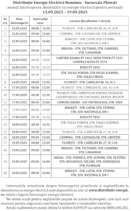 Acasă Actualitate ANUNȚ DISTRIBUȚIE ENERGIE ELECTRICĂ ROMÂNIA ActualitateSocial ANUNȚ DISTRIBUȚIE ENERGIE ELECTRICĂ ROMÂNIA De către Ziarul PRAHOVA - septembrie 5, 2025 1026 (P) ARTICOLE SIMILAREDE LA ACELAȘI AUTOR Actualitate Amenajarea băii cu piatră naturală: eleganță, lux și relaxare Actualitate ANUNȚ DISTRIBUȚIE ENERGIE ELECTRICĂ ROMÂNIA Actualitate Toma Enache – 55 de ani de pasiune, curaj și cinema autentic Urmăreşte-ne0FaniÎmi place Ultimele ştiri Amenajarea băii cu piatră naturală: eleganță, lux și relaxare noiembrie 1, 2025 Sâmbăta morților – Moșii de toamnă noiembrie 1, 2025 E v e n i m e n t noiembrie 1, 2025 ANUNȚ DISTRIBUȚIE ENERGIE ELECTRICĂ ROMÂNIA octombrie 31, 2025 Încărcați mai multe