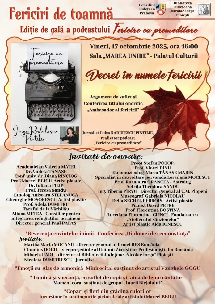 Timp de aproape patru ceasuri, sub semnul   unei toamne  a cărei frumusețe  o tulbură prea des realitatea de fiecare zi- și, nu de puține ori, de-a dreptul răscolitor-  întâlnirea de suflet găzduită, în simbolicul și impunătorul Palat al Culturii din  Ploiești, de Sala ” Marea Unire”,  s-a dovedit   nu  doar cu mult  mai mult decât evenimentul dorit a fi, ci  și deasupra … premeditării sale.  Și pentru a risipi îndoiala asupra unei aprecieri  obiective- deși nu neg cu totul și o firească alăturare  sufletească  la echilibrul și rigoarea relatării- mă grăbesc să   înscriu, cu recunoștință și deopotrivă cu smerenie, chiar de la începutul acestei cronici,  câteva dintre multele  mesaje pe care continui să le primesc despre cea de-a II-a ediție de gală a podcastului ”Fericire cu premeditare” pe care îl realizez și îl prezint:”Am trăit cea mai frumoasă seară a anului 2025, alături de distinșii oaspeți ai doamnei jurnaliste Luiza Rădulescu Pintilie, cea care dă un sens aparte și celor mai simple cuvinte. Compoziția alcătuită din atitudini elegante, gesturi discrete și daruri cu grijă alese a devenit un simbol ce naște povești cu semnificații pe care nu le întâlnim prea des .Așa se face că aseară am putut trăi, cu adevărat, starea de Fericire mai mult decât câteva clipe, așa cum o trăiesc de multe ori”; ”Mulțumim pentru invitația la acest eveniment, la care eleganța a fost în prim-plan!” ; ”Felicitări  pentru  organizarea impecabilă și pentru  ținuta evenimentului ”; ”Vă mulțumesc, distinsă Doamnă a Fericirilor, că existați, vă mulțumesc pentru că a existat întâlnirea noastră, vă mulțumesc pentru recunoașterea valorilor”; ”am asistat cu adevărat   la o poveste superbă a fericirii”; ” admirație și prețuire pentru sensibilitatea și eleganța cu care atingeți inimile celor din jur”; ”ați făcut fericiți un întreg cor, pe părinți și pe preotul lor”; ”ați reușit , sădind semințe de fericire și adunând în jur oameni de calitate, să provocați fericirea”.