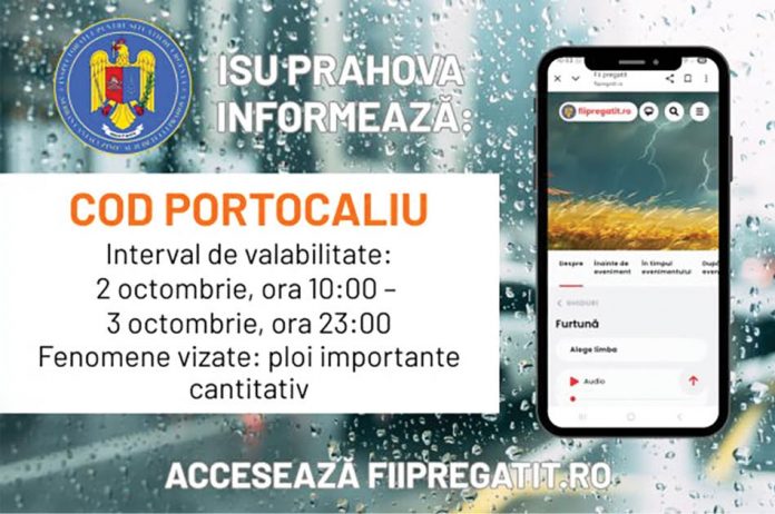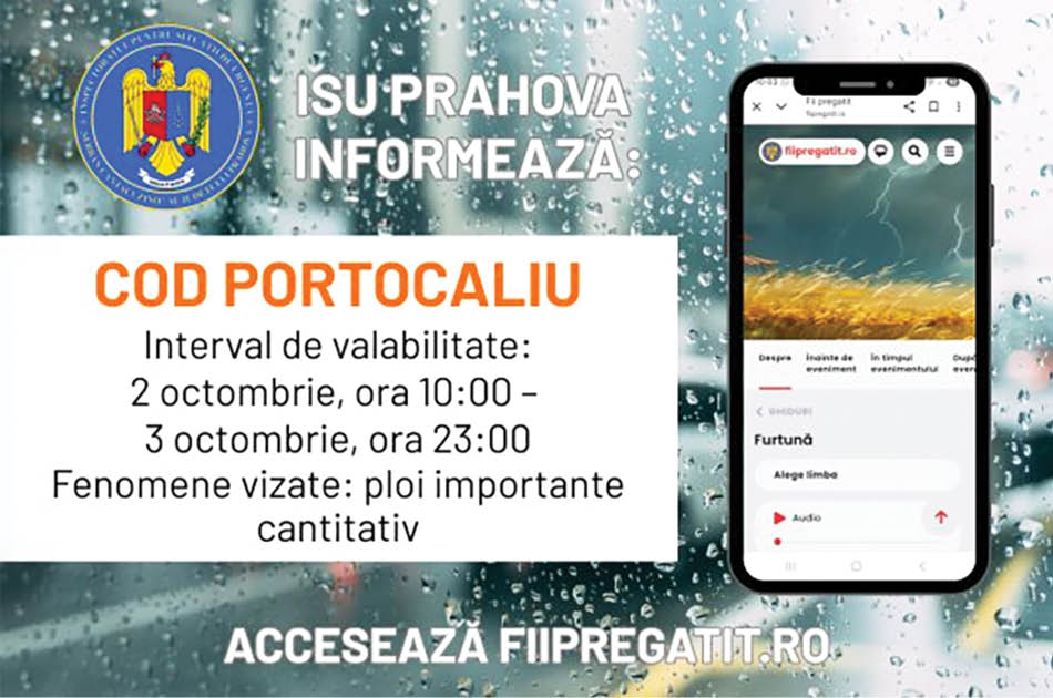 Frontul atmosferic prezent deasupra României i-a determinat pe meteorologi să emită noi avertizări de vreme rea, valabile inclusiv pentru județul Prahova. Astfel, dacă, așa cum v-am anunțat în ediția ziarului nostru de ieri, pentru perioada 2-3 octombrie a.c., inițial fusese emisă pentru județul nostru o avertizare meteorologică de tip Cod galben de ploi, joi de dimineață, atenționarea a fost modificată și transformată în Cod portocaliu, o informare în acest sens primind la redacție și de la reprezentanții Inspectoratului Județean pentru Situații de Urgență (ISU) Prahova. ”Administrația Națională de Meteorologie a emis o avertizare Cod Portocaliu, care vizează județul Prahova, intrată în vigoare din 2.10.2025, ora 10:00, care va fi valabilă până la 3.10.2025, ora 23:00. Fenomenele vizate sunt ploi importante cantitativ, acumulându-se cantități de apă de 70…80 l/mp și izolat de peste 90 l/mp. De asemenea, sunt așteptate intensificări ale vântului și chiar ninsori la altitudini de peste 1.500 m”, au precizat reprezentanții ISU Prahova, care au menționat că situațiile meteorologică și hidrologică sunt monitorizate permanent prin dispeceratul instituției, în vederea luării de măsuri operative rapide, dacă situația din teren o va impune. În acest context, au fost transmise și o serie de recomandări pentru populație: ”Evitați deplasările inutile în zonele vizate de avertizări; nu traversați cursuri de apă și nu staționați pe malurile acestora; curățați șanțurile și rigolele din jurul locuinței pentru a permite scurgerea apelor pluviale; în condiții de vânt puternic, evitați zonele cu arbori, stâlpi sau panouri publicitare și asigurați obiectele care pot fi luate de vânt; închideți și securizați ferestrele și ușile locuințelor; stați departe de acestea dacă vântul suflă cu putere; nu atingeți cablurile electrice căzute la pământ și anunțați imediat autoritățile; în caz de urgență, apelați numărul unic 112”. De asemenea, potrivit ISU Prahova, în contextul avertizărilor emise de Administrația Națională de Meteorologie, Departamentul pentru Situații de Urgență (DSU), împreună cu Inspectoratul General pentru Situații de Urgență (IGSU) au dispus o serie de măsuri pentru gestionarea situațiilor care pot apărea ca urmare a manifestării fenomenelor meteorologice și hidrologice prognozate în perioada următoare. Astfel, preventiv, au fost dispuse următoarele: activarea grupei operative a DSU, împreună cu IGSU, pentru monitorizarea situațiilor înregistrate și dispunerea măsurilor suplimentare pentru eficientizarea misiunilor de răspuns; asigurarea permanenței în localitățile vizate de codurile de vreme rea, la nivelul autorităților locale; convocarea Comitetelor Județene pentru Situații de Urgență și a centrelor județene de coordonare și conducere a intervențiilor în județele aflate sub incidența codurilor roșii (Dolj și Olt) și portocalii; informarea permanentă a populației, prin intermediul canalelor oficiale. Totodată, s-a mai făcut precizarea că, dacă situația o va impune, inspectoratele pentru situații de urgență vor putea realiza ”manevra de forțe și mijloace care să intervină în sprijinul județelor afectate”, prin aceste acțiuni fiind urmărită limitarea efectelor fenomenelor prognozate și intervenția rapidă acolo unde va fi nevoie, dacă situația o va impune. De adăugat faptul că, joi, la ora 10.00, potrivit informațiilor înregistrate de stațiile meteo din județul Prahova, la Ploiești erau 6,2 grade C și ploua, la Sinaia Cota 1500 și la Vârful Omu ningea, în ultimul caz stratul de zăpadă, la ora 9.00, măsurând deja 12 cm.