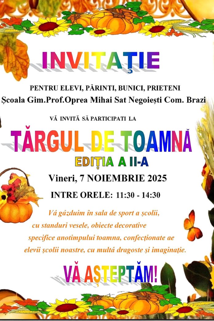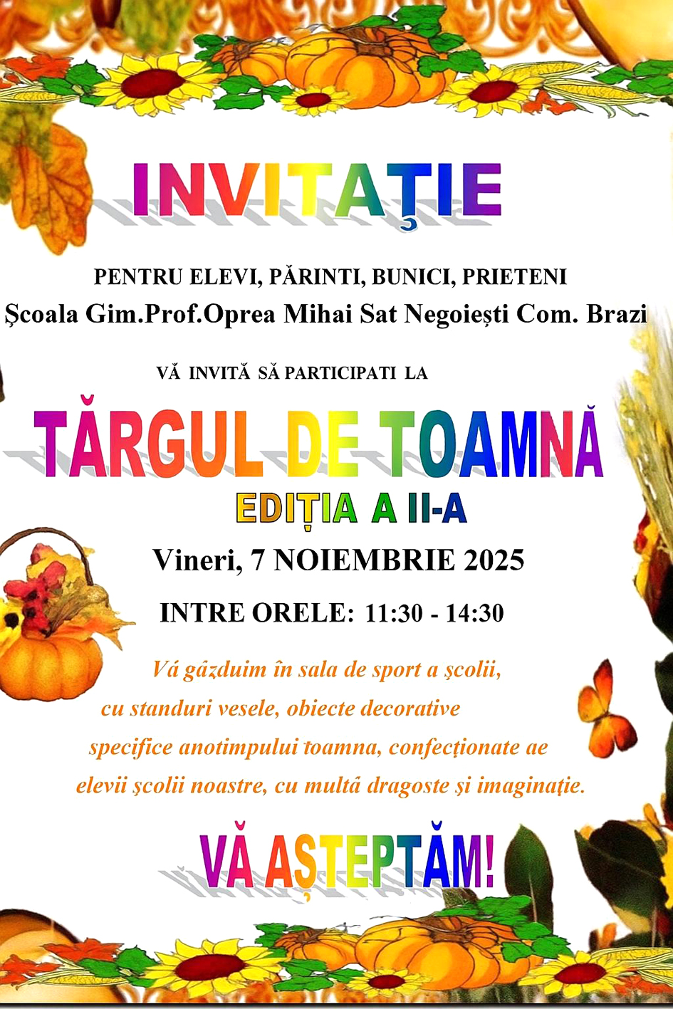 Școala Gimnazială «Prof. Oprea Mihai» din satul Negoiești al comunei Brazi deschide porțile pentru un eveniment plin de culoare și voie bună! Vineri, 7 noiembrie 2025, între orele 11:30 – 14:30, în Sala de sport a școlii se va organiza Târgul de Toamnă – Ediția a II-a!