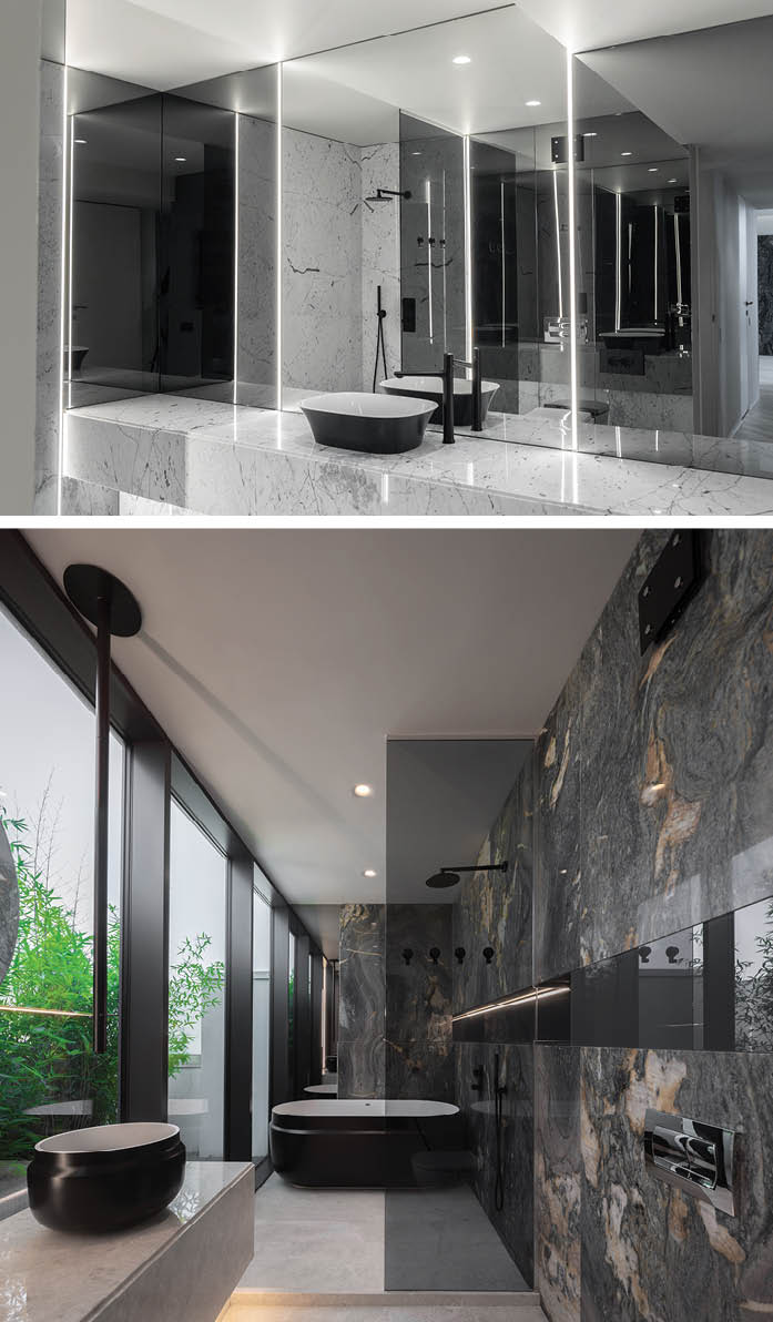 În combinație cu lumini ambientale și accente metalice, aceste materiale transformă baia într-un spațiu senzorial și exclusivist.
