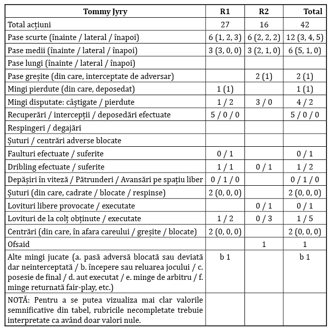 Ar mai fi o mică discuție asupra cifrelor din tabel. Întâi de toate, nu trebuie să uităm că Jyry a fost distribuit în poziția de atacant, de aceea și pasele sunt mai puține la număr. Totodată și posesia superioară a adversarului a cântărit în realizarea acestor cifre. Pasele scurte sunt ușor majoritare înspre înapoi și lateral pentru că ele provin din recuperările de balon în zone libere urmate de clarificarea posesiei pentru propria echipă. Însă, cele de lungime medie au avut o altă direcție, spre înainte, și, lucrul cel mai important, au avut altă consistență și alte consecințe, net cu amenințarea porții adverse.