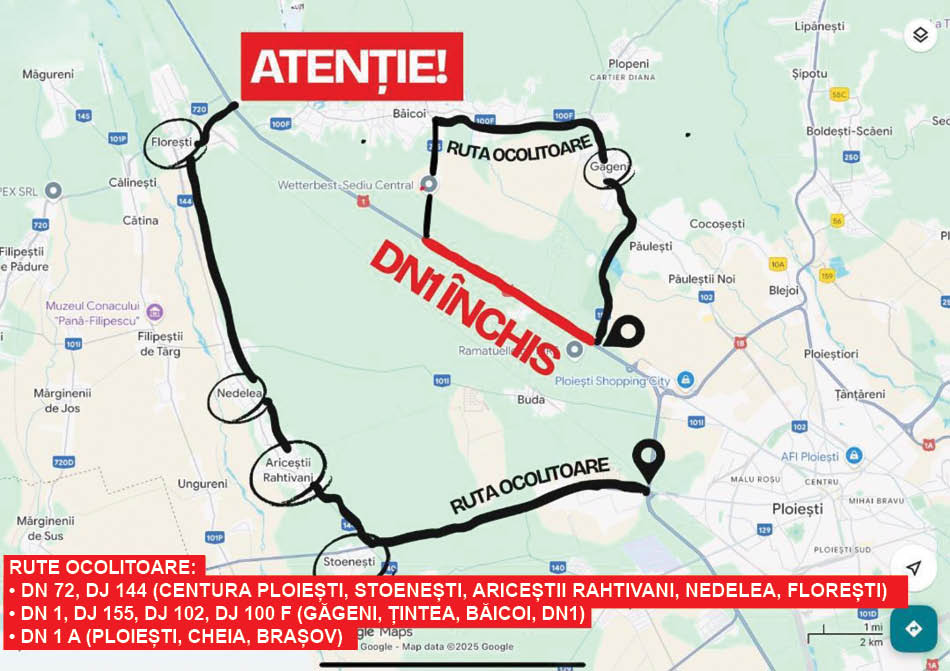 Consiliul Județean Prahova a anunțat restricționarea circulației, de la începutul săptămânii viitoare, timp de patru zile, pe cea mai circulată arteră din județ, respectiv pe DN1, în zona km 69+925 (Movila Vulpii), pentru execuția lucrărilor de refacere a infrastructurii trecerii la nivel cu calea ferată. Măsura va fi valabilă în perioada 24 noiembrie 2025, ora 10.00 – 27 noiembrie 2025, ora 12.00. Conform reprezentanților administrației județene, în acest interval, traficul va fi deviat pe rute alternative, diferențiate în funcție de tonaj. În mod concret, devierea pentru autovehicule sub 3,5 tone a fost stabilită astfel: DN1 – DN72 – DJ144; Centura Ploiești – Stoenești – Ariceștii Rahtivani – Florești – revenire DN1; DN1 – DJ155 – DJ102 – DJ100F; Găgeni – Țintea – Băicoi – revenire DN1, iar pentru autovehicule peste 3,5 tone (trafic greu): DN1A: Ploiești – Văleni – Cheia – Brașov. ”Pe durata lucrărilor, accesul riveranilor și al proprietarilor de terenuri va fi permis pe sectorul închis, conform semnalizării temporare. Vor fi montate panouri și indicatoare specifice pentru orientarea traficului. Circulația va fi reluată în condiții de siguranță după verificările instituțiilor abilitate la finalul perioadei de restricții. Recomandăm conducătorilor auto să planifice din timp traseele și să respecte semnalizarea rutieră temporară. Actualizările vor fi comunicate prin canalele oficiale”, au precizat, joi, reprezentanții Consiliului Județean Prahova, referitor la restricționarea circulației pe DN1, impusă din cauza executării lucrărilor de refacere a infrastructurii trecerii la nivel cu calea ferată, în zona menționată.