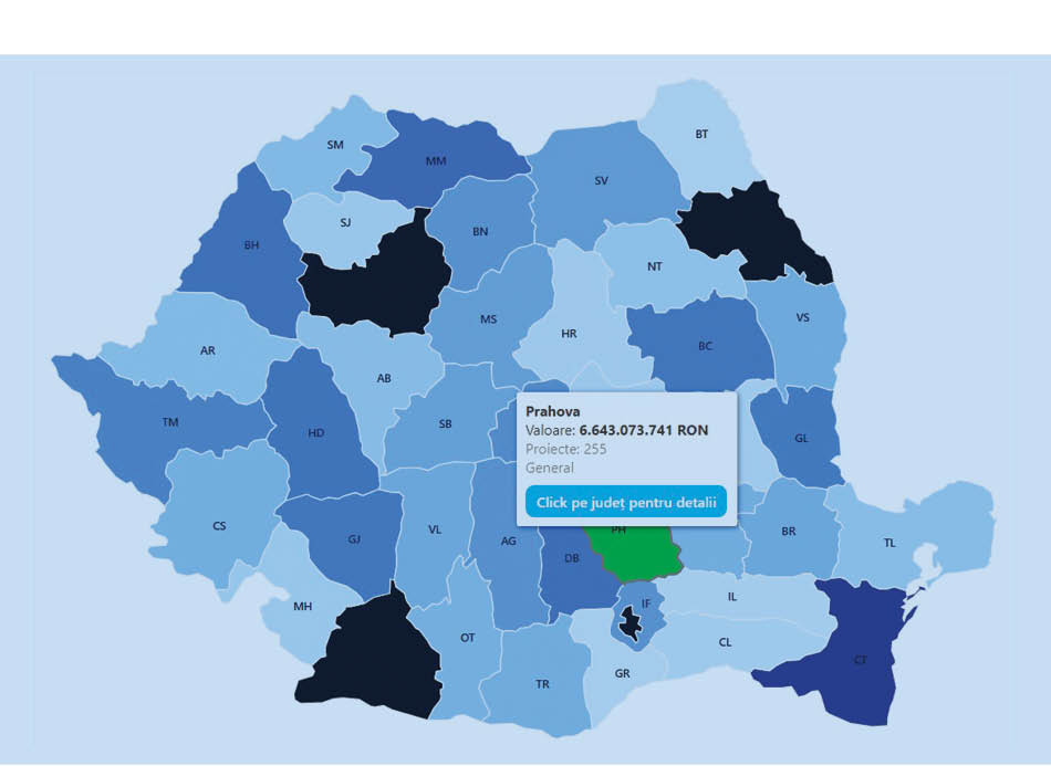 Prin această platformă, oricine poate afla ce proiecte sunt în derulare în localitatea sa, cine le implementează, cât costă și în ce stadiu se află. Harta poate fi explorată simplu, fie după numărul proiectelor, fie după valoarea totală a investițiilor, astfel încât utilizatorii să își poată face rapid o idee despre cum sunt folosiți banii europeni în întreaga țară.