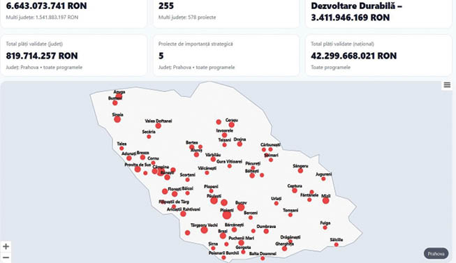 Prahova se află, potrivit datelor din această hartă interactivă, pe locul 6 la nivel național la valoarea celor 255 de proiecte finanțate, cinci de importanță strategică – peste 6,64 miliarde de lei, din care totalul plăților validate pentru proiectele din județ – de 819,7 milioane de lei.