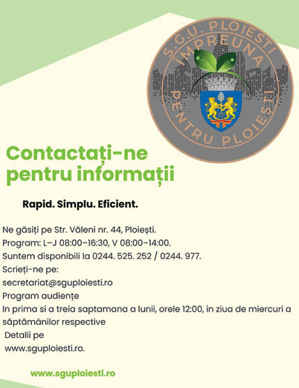 Pentru o mai bună înțelegere a domeniilor de activitate și a responsabilităților sale, SGU Ploiești a lansat o campanie de informare dedicată clarificării rolului societății în viața orașului. Astfel, societate comercială cu capital integral al municipiului Ploiești, Societatea de Gospodărire Urbană Ploiești asigură întreținerea, amenajarea și modernizarea spațiilor verzi, a aliniamentelor stradale, a rondurilor, scuarurilor și parcurilor; administrează și întreține locuri de joacă, fântânile arteziene, foișoarele și mobilierul urban; administrează cimitirele municipale, asigurând servicii specifice; asigură producția horticolă (material dendrofloricol) în pepiniere; efectuează lucrări de tăieri/arboricultură, plantări, toaletări și igienizări sezoniere; intervenții pentru siguranță (exemplu arbori periculoși) și suport logistic pentru evenimente publice. ”Obiectivul acestei campanii este acela de a oferi informații corecte și accesibile despre atribuțiile SGU Ploiești, precum și despre serviciile care nu intră în sfera de competență a societății noastre. Prin această inițiativă, ne propunem să reducem confuziile frecvente și să consolidăm încrederea în comunicarea instituțională”, au precizat reprezentanții societății, care au menționat că în sfera activității acesteia nu intră: ridicarea gunoiului menajer; activitatea de strângere a câinilor fără stăpân; iluminatul public; administrarea piețelor; asfaltarea și lucrările de reparații ale drumurilor. În acest context, societatea a făcut publice și datele de contact (conform imaginii alăturate), pentru a fi la dispoziția tuturor acelora care doresc să transmită sesizări, propuneri sau solicitări legate de activitățile pe care le desfășoară.