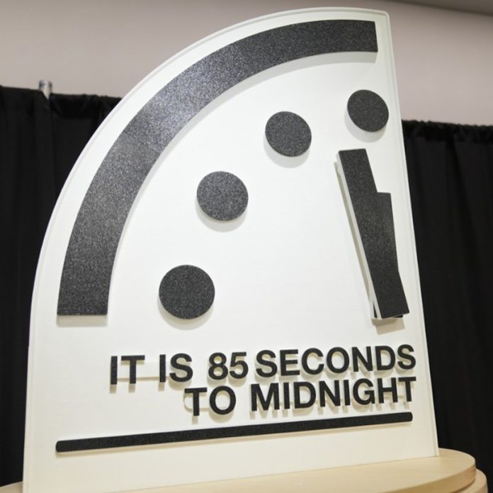 „Ceasul Apocalipsei”, care simbolizează începând din 1947 iminenţa unui cataclism planetar, s-a apropiat mai mult ca niciodată de miezul nopţii, în contextul în care îngrijorările cresc tot mai mult în ceea ce priveşte armele nucleare, schimbările climatice şi dezinformarea, informează AFP, preluată de Agerpres și Mediafax.