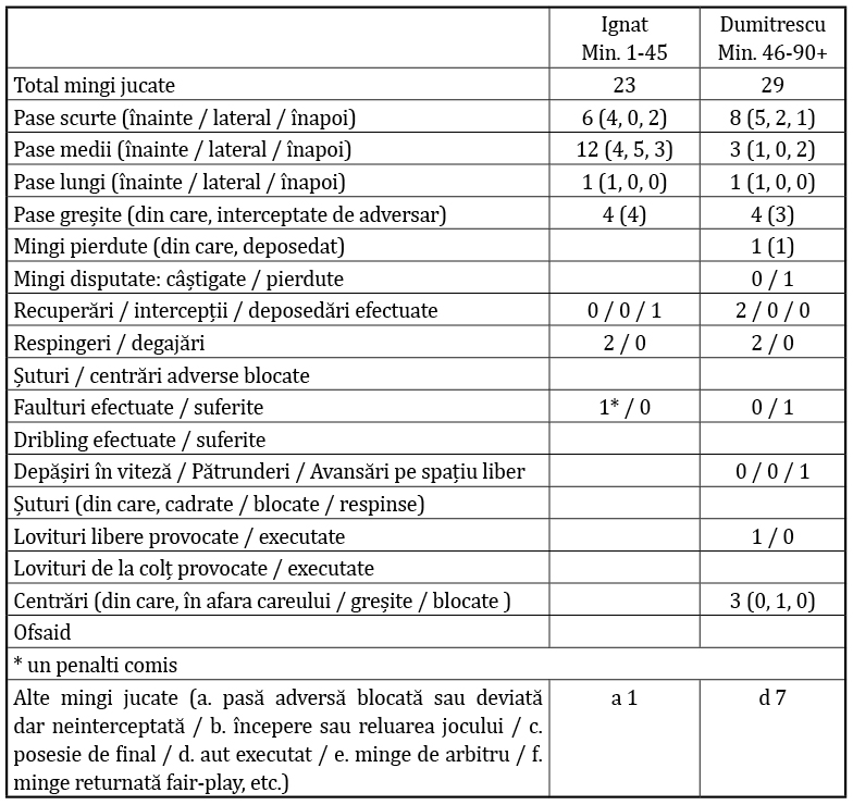 Ignat s-a încadrat perfect în echipa densă în defensivă, „scurtă”, de la care Neagoe a sperat să nu primească gol și să dea lovitura prin aripile de viteză Rareș Pop, alt nou venit, și Valentin Gheorghe, cu contribuția experienței lui Gicu Grozav, într-o poziție inedită, care nu îi este caracteristică și, prin consecință, nu îl ajută deloc. Ce ne facem că această perfecțiune a durat doar ceva mai puțin de un sfert de oră? Chiar Ignat a stricat-o, prin faultul făcut în propriul careu, el intuind prea târziu că, de fapt, centrarea lui Bancu îi este destinată mult mai vivacelui Cicâldău, pătruns în mijlocul careului petrolist (min. 14). Iată ce a dus la primul gol al oltenilor (min. 16)! Ignat nu a fost de mare ajutor defensivei petroliste nici la cel de-al doilea gol marcat de craioveni (min. 17). Nepregătit să blocheze o eventuală minge pierdută – ceea ce i s-a întâmplat lui Dongmo – Ignat s-a trezit distanțat de omul pe care l-a avut în marcaj, craioveanul Nsimba, care, cu două șerpuiri, s-a degajat de noul petrolist și a șutat imparabil. Nici la reluarea lui Etim după pasa primită de la Nsimba, din stânga, Ignat nu a avut o reacție suficient de rapidă pentru a evita șutul (min. 34). Dar, nu trebuie uitat că această din urmă situație s-a ivit după o pasă trimisă de Papp, ieșit din dispozitiv înspre lateral, către un Gicu Grozav supus marcajului, iar craiovenii au recuperat și au jucat exact în spațiul liber lăsat de ex-craioveanul aflat acum în galben-albastru și a cărui încercare ulterioară de a bloca centrarea a fost convingător de … inexistentă. Ar fi de discutat și poziționarea lui Ignat și schimbul cu Papp în marcajul lui Nsimba la golul craiovean anulat la VAR (min. 37), dar haideți să punem asta pe seama relațiilor de joc încă necimentate. Însă, pentru Ignat nu există scuză pentru imprecizia paselor mai lungi, altele decât cele adresate colegilor de linie. Tot acolo intră, zicem noi, și cele câteva momente în care Ignat a „pierdut” linia apărătorilor. Drept consecință, la pauză, Ignat a fost poftit pe bancă. Dovedindu-se un implant reușit doar pentru scurta perioadă din debutul meciului, cea menționată, nu este de dorit ca Ignat să se dovedească un implant respins de organismul echipei.