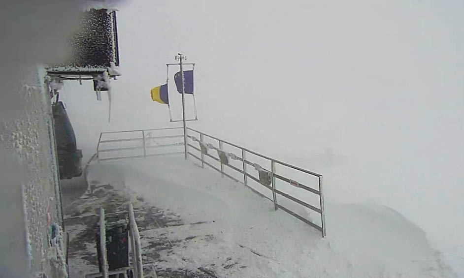 Ca un exemplu al puterii cu care a suflat vântul la Cota 2000, cele două drapele – al României și al UE – arborate sus, la stație, au fost pur și simplu sfâșiate de rafalele extreme (foto).