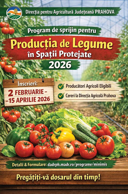 Conform reprezentanților Direcției pentru Agricultură Județeană (DAJ) Prahova, pe data de 2 februarie a.c. va fi demarată procedura de înscriere în Programul de susținere a producției de legume în spații protejate pentru anul 2026, program guvernamental destinat sprijinirii producătorilor agricoli în vederea stimulării producției interne de legume și a valorificării acesteia pe piață. Perioada de depunere a cererilor, care vor fi centralizate de către instituția menționată, este până pe 15 aprilie 2026 (inclusiv), documentele necesare fiind următoarele: Copie B.I./C.I. solicitant /reprezentant legal (după caz); Copie atestat de producător valabil până la 31 decembrie a anului în care se solicită sprijinul; Împuternicire + copie B.I./C.I. reprezentant (după caz); Copie a certificatului eliberat de Oficiul Național al Registrului Comerțului/Registrul național al asociațiilor și fundațiilor/act de funcționare (după caz); Dovadă cont activ bancă/trezorerie; Adeverință (original) din Registrul agricol (anul în curs), care atestă suprafața cu spații protejate utilizată, în baza unui act juridic ce conferă dreptul de folosință. ”Sprijinul financiar este de 1,5 euro/mp (1.500 euro/1.000 mp), pentru o suprafață cumulată de minimum 1.000 mp, cu respectarea condițiilor de eligibilitate și a producțiilor minime. Solicitanții trebuie să îndeplinească următoarele condiții: utilizarea a minimum 1.000 mp de spații protejate; sunt înregistrați în Registrul agricol al unității administrativ-teritoriale unde se află suprafața; dețin Registrul de evidență a tratamentelor cu produse de protecție a plantelor; produc legume care nu depășesc limitele maxime de reziduuri de pesticide”, au precizat reprezentanții DAJ Prahova. Totodată, precizând că dovada producției de legume obținute în spații protejate o constituie fila/filele din carnetul de comercializare a produselor agricole/e-facturile și extrase din Spațiul Privat Virtual, pentru legumele care fac obiectul acestui program, emise după data înregistrării cererii de înscriere, reprezentanții instituției au detaliat care trebuie să fie și producțiile minime la care trebuie să se încadreze toți cei care vor fi încadrați ca producători agricoli eligibili în cadrul Programului de susținere a producției de legume în spații protejate. Concret: Ardei gras/ lung/gogoșar – 2.000 kg / 1.000 mp; Ardei iute – 600 kg/1.000 mp; Castraveți – 4.000 kg/1.000 mp; Ceapă verde – 100.000 bulbi/plante/1.000 mp; Fasole păstăi – 1.500 kg/1.000 mp; Salată – 10.000 plante/1.000 mp; Spanac – 1.000 kg/1.000 mp; Tomate – 3.000 kg/1.000 mp; varză – 4.000 kg/1.000 mp; Vinete – 4.000 kg/ 1.000 mp.