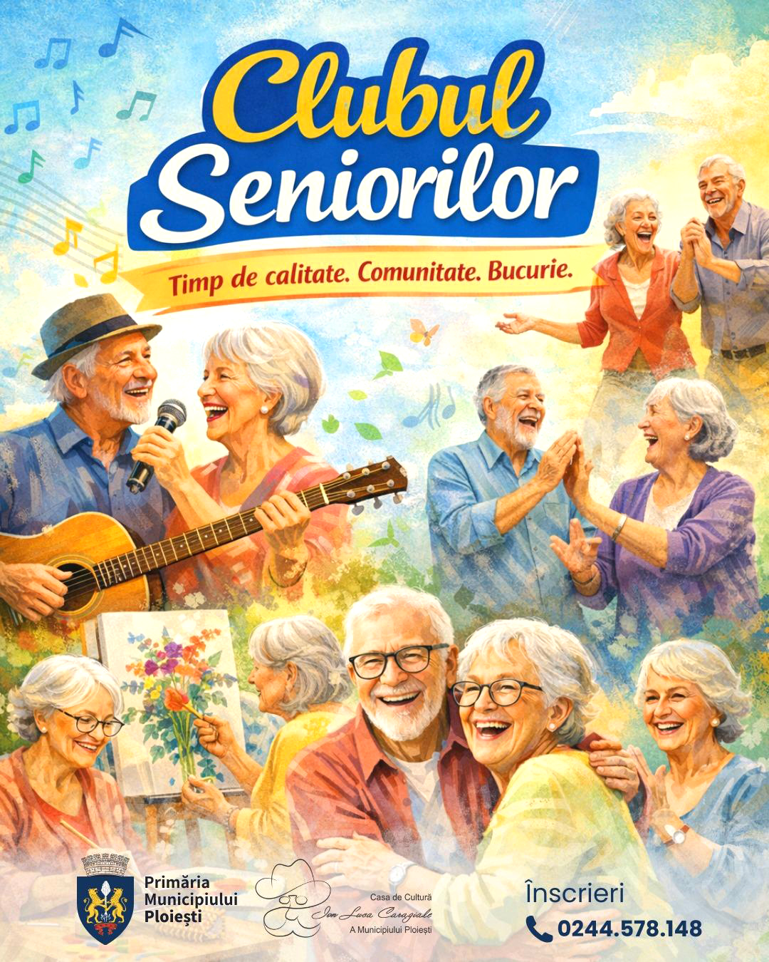 Este vorba despre ”Clubul Seniorilor”, în cadrul căruia va fi organizat un program cultural-educativ pentru persoanele de peste 60 de ani care își doresc să rămână active, să socializeze și să se bucure de timp de calitate într-o, așa cum s-a menționat, comunitate prietenoasă. ”După succesul programului de mișcare pentru seniori – cursuri gratuite de dans și gimnastică ușoară, ce a fost lansat la finalul anului trecut, continuăm cu o nouă inițiativă dedicată persoanelor de vârsta a treia. Clubul Seniorilor reprezintă un spațiu de întâlnire, exprimare și bună dispoziție, unde fiecare participant este încurajat să își descopere pasiunile și să își pună în valoare creativitatea”, au precizat reprezentanții municipalității. Proiectul este derulat de Casa de Cultură „Ion Luca Caragiale” Ploiești, cu sprijinul primăriei, și include o serie de activități, precum: canto/muzică vocală; teatru; ateliere handmade; percuție, ritm și mișcare; muzică de altădată, karaoke, concursuri; ateliere de autocunoaștere și dezvoltare personală; activități recreative și sociale. Înscrierea la acest club se poate face la secretariatul Casei de Cultură “Ion Luca Caragiale” Ploiești, la telefon 0244/578.148, sau prin e-mail, la adresa secretariat@casadecultura.ro. Deocamdată nu a fost stabilit și locul de desfășurare a activităților amintite, acesta urmând să fie făcut public de către autoritățile locale după finalizarea înscrierilor.