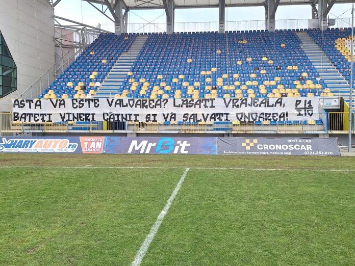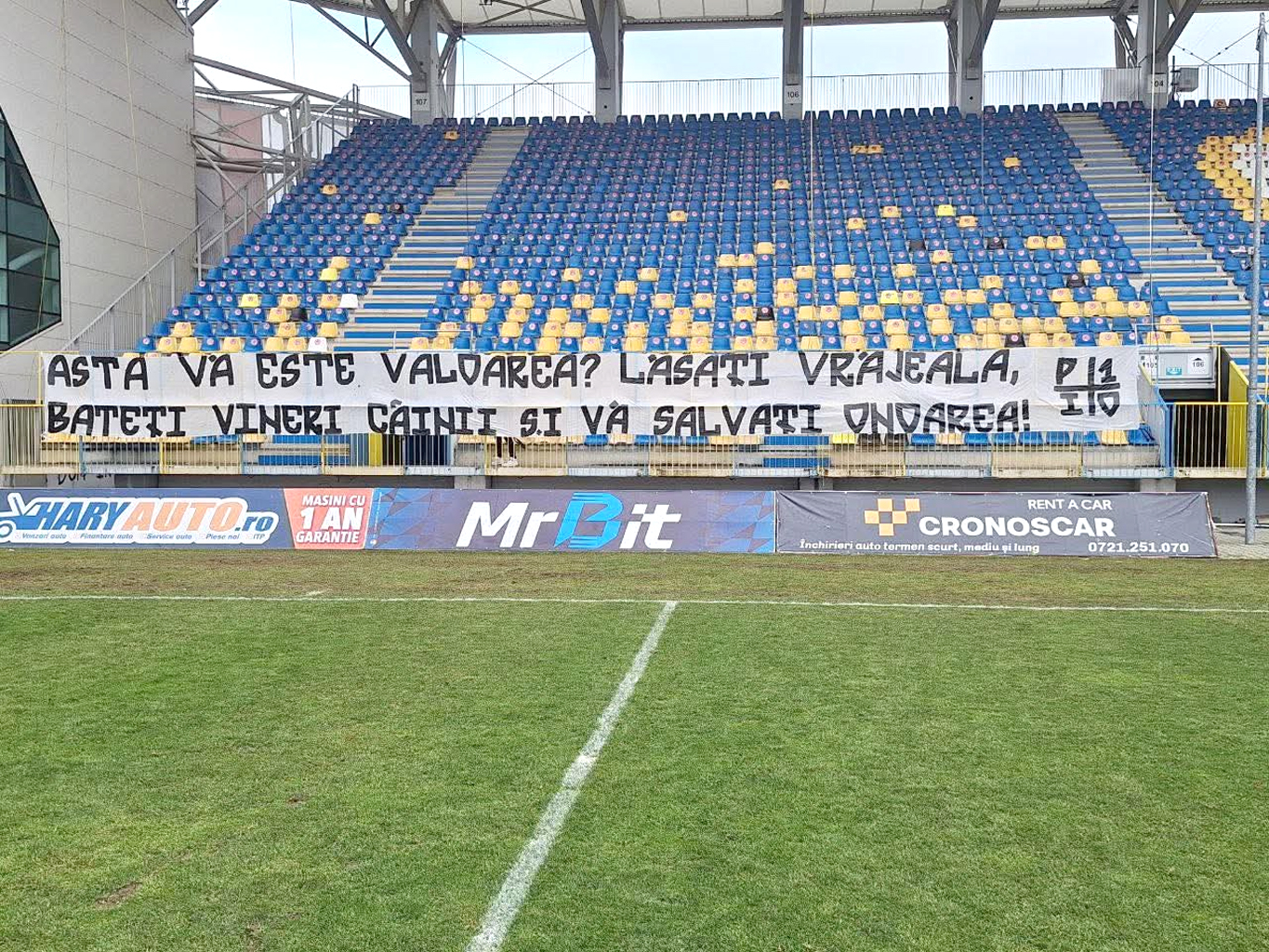 «Asta vă este valoarea? Lăsați vrăjeala / Bateți vineri câinii și vă salvați onoarea”, a fost mesajul celor de la Peluza I Ilie Oană, afișat chiar pe stadion, pentru a fi văzut de jucători înaintea întâlnirii din această seară, de la ora 20.00.