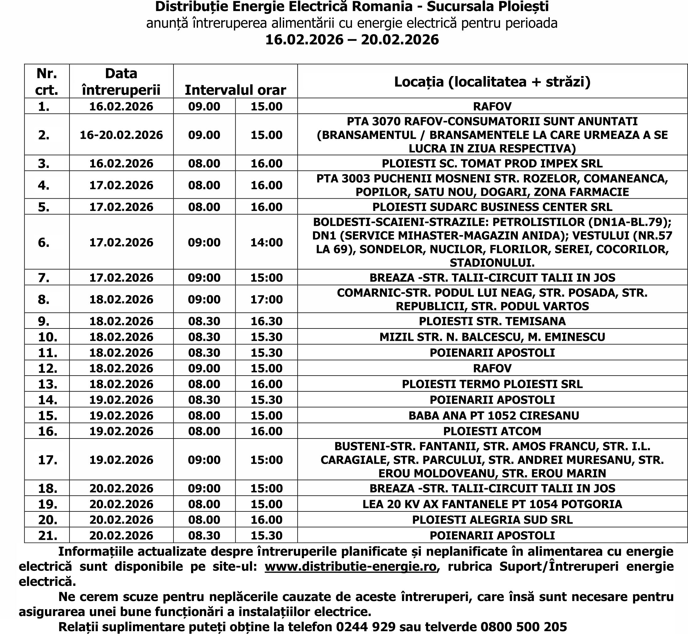 Acasă Actualitate ANUNȚ DISTRIBUȚIE ENERGIE ELECTRICĂ ROMÂNIA ActualitateSocial ANUNȚ DISTRIBUȚIE ENERGIE ELECTRICĂ ROMÂNIA De către Ziarul PRAHOVA - februarie 6, 2026 107 (P) ARTICOLE SIMILAREDE LA ACELAȘI AUTOR Actualitate Spania a atins un nou record istoric în turism şi îşi regândeşte strategia Actualitate Acordarea subvenţiei pentru păşunat se face după noi reguli Sănătate CAS Prahova face precizări în legătură cu eliminarea plății primei zile de concediu medical Urmăreşte-ne0FaniÎmi place Ultimele ştiri ANUNȚ DISTRIBUȚIE ENERGIE ELECTRICĂ ROMÂNIA februarie 6, 2026 O nouă amânare în dosarul privind începerea procesului lui Iulian Dumitrescu februarie 6, 2026 Succes lejer februarie 6, 2026 Trial handbalistic februarie 6, 2026 Încărcați mai multe