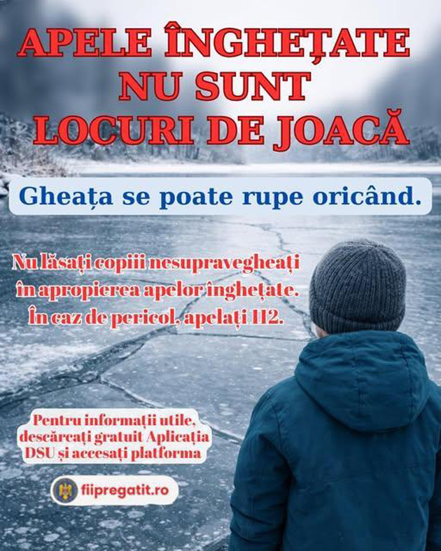Pe cale de consecință, reprezentanții instituției adresează «un apel sincer către părinți și aparținători: Nu lăsați copiii nesupravegheați în apropierea lacurilor, râurilor sau bălților înghețate. Vorbiți-le despre riscuri și explicați-le că gheața nu este un loc de joacă.Gheața se poate rupe în orice clipă, iar apa rece poate deveni fatală în doar câteva minute. Chiar dacă gheața pare solidă, se poate rupe în orice moment, punând vieți în pericol. Nu pășiți pe gheață, indiferent de grosimea aparentă; Evitați intervențiile improvizate dacă observați o persoană în pericol. Apelați imediat 112 în caz de urgență».