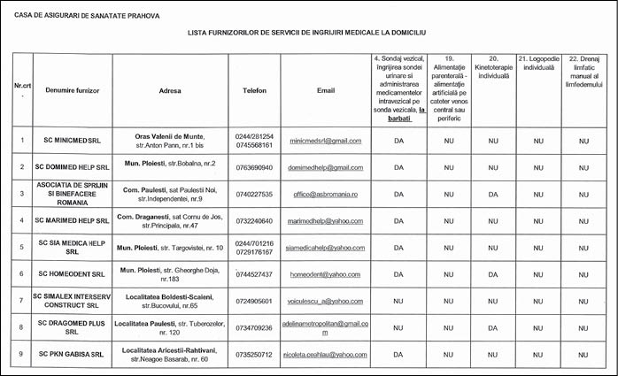 Așa cum mai reiese din răspunsul primit de la CAS Prahova, furnizorii de servicii de îngrijiri medicale la domiciliu (a căror listă se poate citi alăturat) acordă servicii conform unui plan de îngrijiri stabilit în conformitate cu recomandările făcute de către medicii de familie, medicii de specialitate din ambulatoriul de specialitate şi medicii de specialitate din spital, zilnic, inclusiv sâmbăta, duminica şi în timpul sărbătorilor legale. ”Planul de îngrijiri poate fi modificat numai cu avizul medicului care a emis recomandarea de îngrijiri medicale la domiciliu, aviz transmis electronic, certificat cu semnătura electronică extinsă/calificată a acestuia”. În răspunsul ce ne-a fost transmis, s-a mai menționat că există un pachet de servicii medicale de bază pentru îngrijiri medicale la domiciliu, care include: măsurarea parametrilor fiziologici (temperatură, puls etc.); administrarea medicamentelor, inclusiv injectabil; manevre terapeutice pentru evitarea complicațiilor vasculare ale membrelor; îngrijirea plăgilor simple sau a escarelor, a tuburilor de dren; aplicarea de ploscă; kinetoterapie individuală; logopedie individuală; drenaj limfatic; recoltarea probelor biologice etc. Nu în ultimul rând, reprezentanții CAS Prahova ne-au mai precizat: