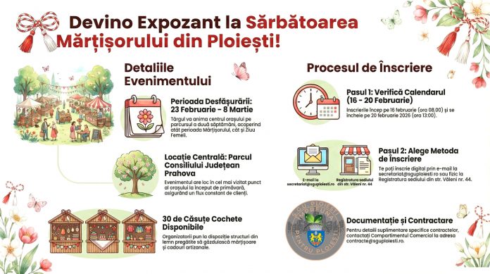Având în vedere că se apropie zilele de 1 și 8 Martie, SGU Ploiești a anunțat că pune la dispoziția comercianților de mărțișoare, dar și artizanilor, spații de vânzare speciale, în vederea organizării Târgului de mărțișoare ce va fi amenajat în centrul Ploieștiului. ”În perioada 23 februarie – 8 Martie, parcul din fața sediului Consiliului Județean Prahova se transformă într-un loc de poveste, plin de simboluri și culoare. Pentru artizani și comercianți punem la dispoziție 30 de căsuțe cochete, gata să găzduiască cele mai frumoase mărțișoare și cadouri de sezon! Perioada de înscriere este 16 februarie, ora 8.00- 20 februarie 2026, ora 13.00. Înscrierile se pot face prin e-mail la: secretariat@sguploiesti.ro sau personal, la sediul din str. Văleni nr. 44 (Registratură). Cererea tipizată de înscriere este disponibilă prin intermediul https://sguploiesti.ro/…/Formular-inscriere-Targul. Pentru detalii suplimentare, echipa de la Compartimentul Comercial stă la dispoziție persoanelor interesate prin intermediul contracte@sguploiesti.ro”, au precizat reprezentanții SGU Ploiești.