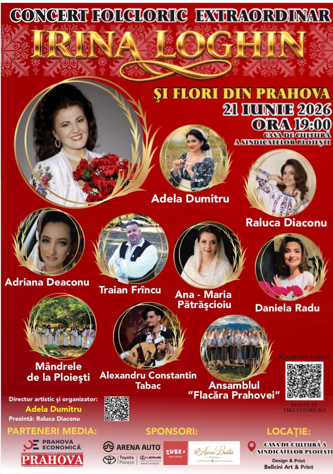 Născută pe meleaguri prahovene, pe Valea Teleajenului, la Gura Vitioarei, în zona orașului Vălenii de Munte, artista considerată ” Regina muzicii populare românești” vine în fața spectatorilor de acasă nu numai cu recunoașterea unei cariere de aproape șase decenii, nu numai cu iubirea și aprecierea multor generații de ascultători câștigate prin unicitatea și frumusețea glasului, prin respectul față de scenă și față de fiecare apariție, prin căldura și apropierea cu care și-a onorat publicul, ci și cu puterea și valoarea unui model de împlinire a destinului artistic pentru cei care, reprezentanți ai noilor generații, la rându-le simt aceeași chemare. Venită pe lume în vremuri de război, de sărăcie și de foamete, deprinzând în familie dragostea de a cânta și remarcându-se încă din primele clase de școală, atrasă într-un fel aparte de vocile ” de aur” ale Ioanei Radu, Mariei Lătărețu, Mariei Tănase, Irina Loghin a devenit, la rândul său, de-a lungul timpului, solistă a prestigioaselor ansambluri folclorice „Ciocârlia”, „Barbu Lăutaru” și „Ciprian Porumbescu”, făcând nemuritoare cântece precum „Măi bădiță de pe grui”, „Foicică din ponoare”, „Întoarce-te bade-n sat”, „Cei trei brazi de la Sinaia”, „Spune, măiculiță, spune” ,dar și „Să cânt, cu drag, omului” sau „Știi, omule, ce e viața?”. Or, repertoriul său valoros, intrat în istoria cântecului popular românesc, dar și în inimile multor iubitori de folclor, se cuvine să fie cunoscut, să fie promovat și păstrat ca o neprețuită comoară de spiritualitate și exact acest lucru își propune proiectul la care ne referim. Cu atât mai valoros cu cât vine din partea unui dascăl și a unui mentor al tinerilor artiști care se pregătesc în Colegiul de Artă ”Carmen Sylva ” din Ploiești, profesoara Adela Dumitru Dumitrache fiind fondatoare a unui grup folcloric tot mai apreciat și ea însăși o interpretă care se impune prin exigența, respectul și dăruirea cu care slujește cântecul și publicul. Mai mult decât atât, concertul ce va fi organizat pe 21 iunie a.c., la Casa de Cultură a Sindicatelor din Ploiești, va aduce pe scena înnobilată de prezența artistei Irina Loghin și o serie de interpreți reprezentativi ai județului Prahova, precum și ansambluri de dans popular- o șansă și un privilegiu pentru noile generații de artiști . Astfel, în fața publicului vor evolua interpreții : Adela Dumitru, Raluca Diaconu, Traian Frâncu, Adriana Deaconu, Daniela Radu, , Ana Maria Pătrășcioiu, Feciorul Alexandru Constantin Tabac și Grupul vocal de fete „Mândrele de la Ploiești” , care fac parte din clasa de Canto popular ” Cununa Muntenească a Colegiului de Artă ”Carmen Sylva” din Ploiești (coordonat de prof. Adela Dumitru) și Ansamblul folcloric de cântece si dansuri populare „Flacăra Prahovei” (coregraf Marian Marinică).