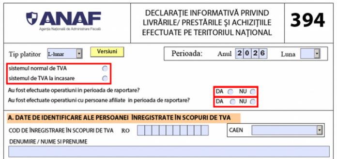 ANAF reamintește firmelor că luni, 30 martie 2026, este termenul de depunere a Formularului 394 – Declarația informativă privind livrările/prestările și achizițiile efectuate pe teritoriul național de persoanele înregistrate în scopuri de TVA, potrivit StartUp Café.
