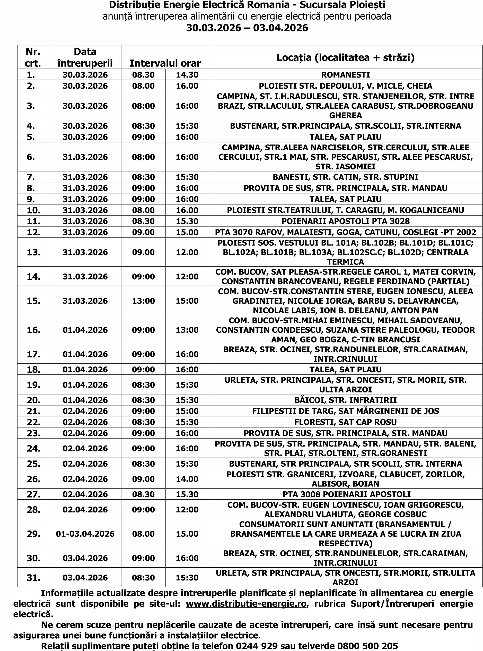 Acasă Actualitate ANUNȚ DISTRIBUȚIE ENERGIE ELECTRICĂ ROMÂNIA ActualitateSocial ANUNȚ DISTRIBUȚIE ENERGIE ELECTRICĂ ROMÂNIA De către Ziarul PRAHOVA - martie 20, 2026 105 (P) ARTICOLE SIMILAREDE LA ACELAȘI AUTOR Actualitate Patul, piesa centrală care dă tonul întregului dormitor Actualitate Peste jumătate dintre români sar peste mese şi mănâncă mai puţin din motive financiare Actualitate Locuințe ANL pentru tinerii din Blejoi: proiect în stadiu avansat de execuție Urmăreşte-ne0FaniÎmi place Ultimele ştiri Patul, piesa centrală care dă tonul întregului dormitor martie 20, 2026 ANUNȚ DISTRIBUȚIE ENERGIE ELECTRICĂ ROMÂNIA martie 20, 2026 APIA Prahova: Este interzisă arderea miriştilor şi a vegetaţiei pajiştilor permanente! martie 20, 2026 Două echipe ploieştene la turneele semifinale de handbal! martie 20, 2026 Încărcați mai multe