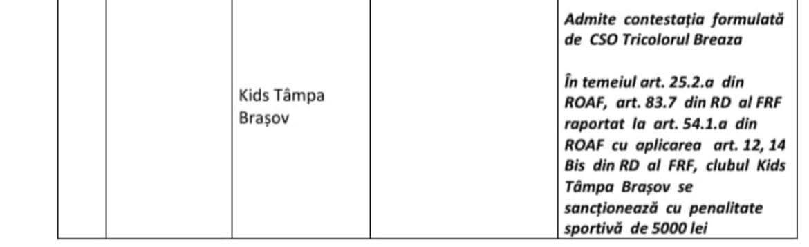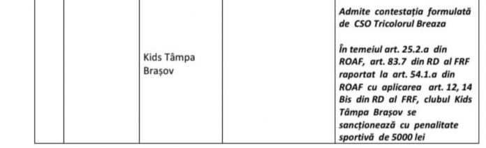 Așa cum s-a menționat în ziua partidei, înaintea jocului din etapa cu numărul 21 a Ligii a 3-a, team managerul formației Tricolorul Breaza a înaintat o contestație cu privire la calificarea cadrelor medicale ce au asigurat asistența la jocul cu Kids Tâmpa Brașov, pierdut cu 1-0. „Pentru corecta informare a faptelor, menționăm că asistența medicală de la acest joc a fost asigurată de doi medici rezidenți; conform legilor în vigoare din domeniul sanitar. Cazul a fost judecat cu celeritate de FRF, care a stabilit admiterea contestației brezene, fiind, practic, confirmat ca întemeiat motivul contestației, aplicându-se o penalitate sportivă de 5000 de lei, dar menținând rezultatul din teren. Pe deplin conștienți de acest fapt, considerăm că, prin sentința stabilită, s-a făcut o nedreptate, întrucât jocul de vineri, conform reglementărilor în vigoare, nu ar fi trebuit să se dispute, în condițiile în care, din punct de vedere regulamentar, nu a fost asigurată asistența medicală. Cu siguranță, în situația în care echipa noastră ar fi refuzat jocul din acest motiv, am fi fost sancționați cu pierderea acestuia. În condițiile în care vorbim despre una dintre cele mai echilibrate valoric serii ale Ligii a treia naționale, fiecare partidă având o importanță de necontestat pentru echipele combatante, în contextul unei lupte deschise, locurile 4 și 12 fiind despărțite de numai nouă puncte, verdictul Comisiei de Disciplină a FRF ne surprinde.” – se arată într-un comunicat al clubului, care, dacă ar fi câștigat ‘la masa verde” acest joc ar fi avut ca și asigurată prezența în play-off.