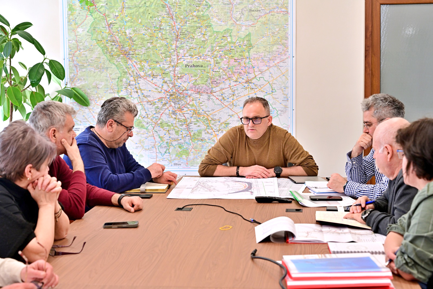 Președintele Consiliului Județean Prahova, Virgiliu Daniel Nanu, a convocat, vineri 13 martie, o ședință de lucru dedicată proiectului centurii ocolitoare Azuga–Bușteni, în prezența reprezentanților Distrigaz, ai Apelor Române, ai antreprenorului general Coni, ai supervizorului Irimat și ai proiectantului Bomaco.
