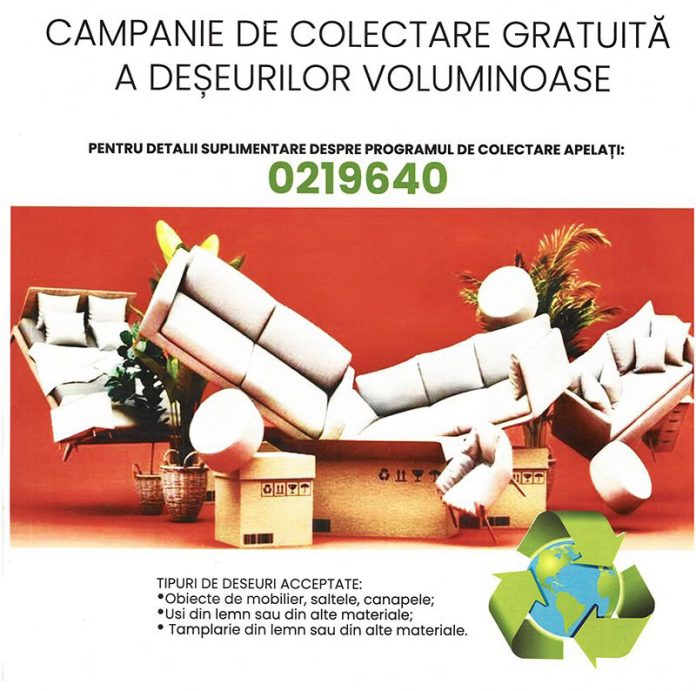 Așa cum v-am informat, la începutul lunii martie a.c., operatorul de salubritate Bin Go Solutions a demarat și acțiunea ce vizează colectarea, de la populație, în mod gratuit, a deșeurilor voluminoase. Tipurile de deșeuri care sunt colectate în cadrul acestei campanii sunt obiecte de mobilier, saltele, canapele, uși din lemn sau din alte materiale, tâmplărie din lemn sau din alte materiale.