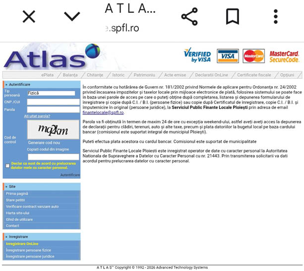 Potrivit Serviciului Public Finanțe Locale Ploiești, instituția pune la dispoziția contribuabililor ploieșteni o gamă variată de servicii online, menite să simplifice relația cu administrația fiscală locală, prin intermediul platformei digitale ATLAS. Prin accesarea platformei digitale menționate, contribuabilii beneficiază de următoarele servicii: vizualizare situație patrimonială și istoric plăți; efectuare plăți; solicitare și eliberare certificat fiscal; declarare și scoatere din evidență clădiri și terenuri; declarare și scoatere din evidență a mijloacelor de transport – în acest caz este necesară numai scanarea documentelor solicitate, fără completarea declarațiilor aferente, acestea făcându-se prin preluarea automată a datelor din Cartea de Identitate a Vehiculului; verificarea autenticității numărului din Registrul Electronic al Mijloacelor de Transport supuse Înmatriculării și Înregistrării; la cerere, comunicarea oricărui document existent în dosarul fiscal.”Pentru persoanele fizice și juridice înrolate în platforma digitală ATLAS, certificatele de atestare fiscală se eliberează în aceeași zi, fără nicio taxă. Înrolarea în platformă se face pe baza unei parole de acces, obținută în urma depunerii formularului de înregistrare, la adresa de email finantelocale@spfl.ro. Formularul va fi însoțit de copia actului de identitate în cazul persoanelor fizice și de copia certificatului de înregistrare, copia actului de identitate al împuternicitului, precum și împuternicirea acestuia, în cazul persoanelor juridice”, au precizat reprezentanții fiscului local din Ploiești. S-a menționat că parola de acces la platforma digitală ATLAS este transmisă solicitantului în termen de maximum 24 de ore, cu excepția zilelor libere, iar accesarea se face prin: scanarea codului QR, care se găsește atât pe site-ul www.spfl.ro, cât și pe pagina de Facebook a Serviciului Public de Finanțe Locale Ploiești; accesarea linkului https://online.spfl.ro/plata/aspx/creare_cont.aspx. Până în prezent, în platforma digitală menționată sunt înrolați 14.053 contribuabili, persoane fizice și juridice.