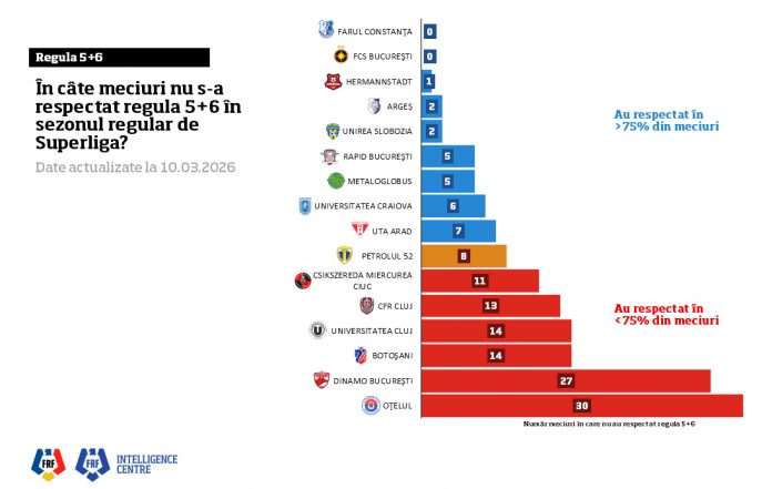 Departamentul Intelligence Centre din cadrul Federației Române de Fotbal a realizat o analiză privind respectarea regulii „5+6” la finalul sezonului regular din SuperLiga României, ediția 2025/2026. Datele evidențiază cluburile care au mizat cel mai mult pe jucătorii români eligibili pentru echipele naționale.