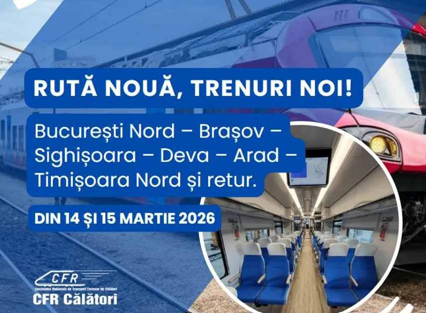 CFR Călători a introdus în circulație, din weekend, trenuri noi pe o rută nouă din programul de circulație: București Nord – Brașov – Sighișoara – Deva – Arad – Timișoara Nord și retur, astfel: IR 16021 București Nord (11:20) – Timișoara Nord (23:12), începând cu 14 martie 2026 și IR 16023 Timișoara Nord (09:09) – București Nord (21:11), începând cu 15 martie 2026.